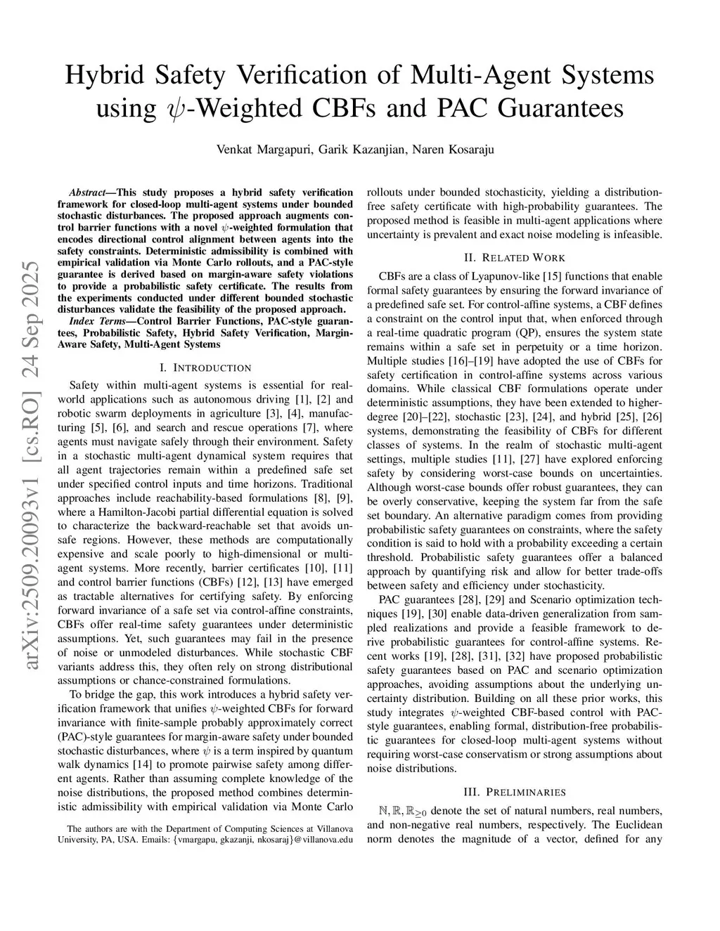 This study proposes a hybrid safety verification framework for closed-loop multi-agent systems under bounded stochastic disturbances. The proposed approach augments control barrier functions with a novel -weighted formulation that encodes directional control alignment between agents into the safety constraints. Deterministic admissibility is combined with empirical validation via Monte Carlo rollouts, and a PAC-style guarantee is derived based on margin-aware safety violations to provide a probabilistic safety certificate. The results from the experiments conducted under different bounded stochastic disturbances validate the feasibility of the proposed approach.