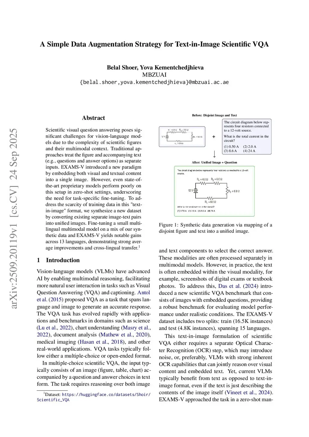 Scientific visual question answering poses significant challenges for vision-language models due to the complexity of scientific figures and their multimodal context. Traditional approaches treat the figure and accompanying text (e.g., questions and answer options) as separate inputs. EXAMS-V introduced a new paradigm by embedding both visual and textual content into a single image. However, even state-of-the-art proprietary models perform poorly on this setup in zero-shot settings, underscoring the need for task-specific fine-tuning. To address the scarcity of training data in this "text-in-image" format, we synthesize a new dataset by converting existing separate image-text pairs into unified images. Fine-tuning a small multilingual multimodal model on a mix of our synthetic data and EXAMS-V yields notable gains across 13 languages, demonstrating strong average improvements and cross-lingual transfer.