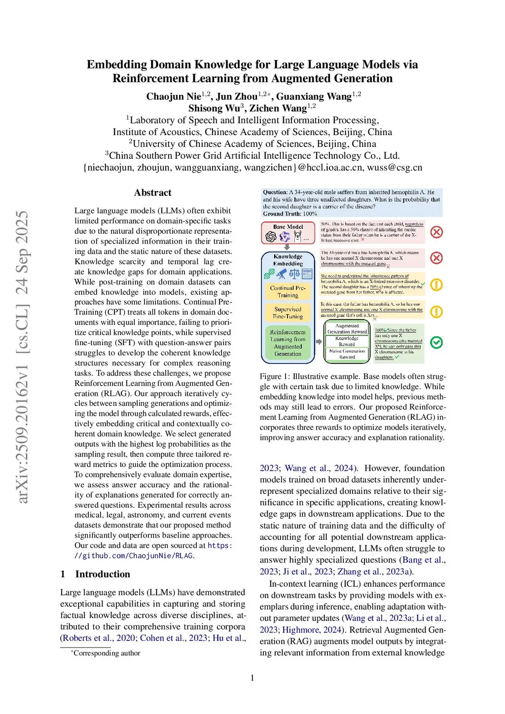 Large language models (LLMs) often exhibit limited performance on domain-specific tasks due to the natural disproportionate representation of specialized information in their training data and the static nature of these datasets. Knowledge scarcity and temporal lag create knowledge gaps for domain applications. While post-training on domain datasets can embed knowledge into models, existing approaches have some limitations. Continual Pre-Training (CPT) treats all tokens in domain documents with equal importance, failing to prioritize critical knowledge points, while supervised fine-tuning (SFT) with question-answer pairs struggles to develop the coherent knowledge structures necessary for complex reasoning tasks. To address these challenges, we propose Reinforcement Learning from Augmented Generation (RLAG). Our approach iteratively cycles between sampling generations and optimizing the model through calculated rewards, effectively embedding critical and contextually coherent domain knowledge. We select generated outputs with the highest log probabilities as the sampling result, then compute three tailored reward metrics to guide the optimization process. To comprehensively evaluate domain expertise, we assess answer accuracy and the rationality of explanations generated for correctly answered questions. Experimental results across medical, legal, astronomy, and current events datasets demonstrate that our proposed method significantly outperforms baseline approaches. Our code and data are open sourced atthis https URL.