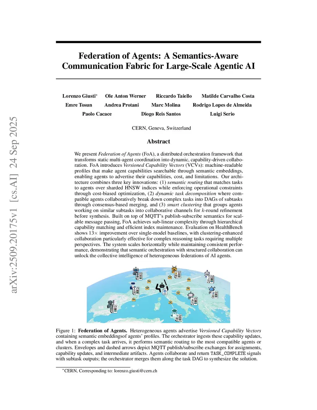We present Federation of Agents (FoA), a distributed orchestration framework that transforms static multi-agent coordination into dynamic, capability-driven collaboration. FoA introduces Versioned Capability Vectors (VCVs): machine-readable profiles that make agent capabilities searchable through semantic embeddings, enabling agents to advertise their capabilities, cost, and limitations. Our aarchitecturecombines three key innovations: (1) semantic routing that matches tasks to agents over sharded HNSW indices while enforcing operational constraints through cost-biased optimization, (2) dynamic task decomposition where compatible agents collaboratively break down complex tasks into DAGs of subtasks through consensus-based merging, and (3) smart clustering that groups agents working on similar subtasks into collaborative channels for k-round refinement before synthesis. Built on top of MQTT,s publish-subscribe semantics for scalable message passing, FoA achieves sub-linear complexity through hierarchical capability matching and efficient index maintenance. Evaluation on HealthBench shows 13x improvements over single-model baselines, with clustering-enhanced laboration particularly effective for complex reasoning tasks requiring multiple perspectives. The system scales horizontally while maintaining consistent performance, demonstrating that semantic orchestration with structured collaboration can unlock the collective intelligence of heterogeneous federations of AI agents.