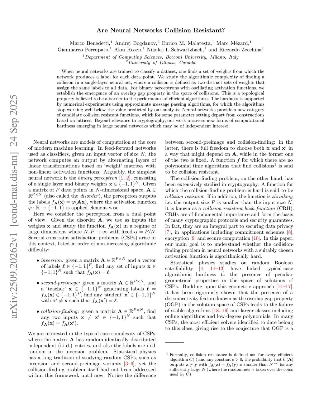 When neural networks are trained to classify a dataset, one finds a set of weights from which the network produces a label for each data point. We study the algorithmic complexity of finding a collision in a single-layer neural net, where a collision is defined as two distinct sets of weights that assign the same labels to all data. For binary perceptrons with oscillating activation functions, we establish the emergence of an overlap gap property in the space of collisions. This is a topological property believed to be a barrier to the performance of efficient algorithms. The hardness is supported by numerical experiments using approximate message passing algorithms, for which the algorithms stop working well below the value predicted by our analysis. Neural networks provide a new category of candidate collision resistant functions, which for some parameter setting depart from constructions based on lattices. Beyond relevance to cryptography, our work uncovers new forms of computational hardness emerging in large neural networks which may be of independent interest.