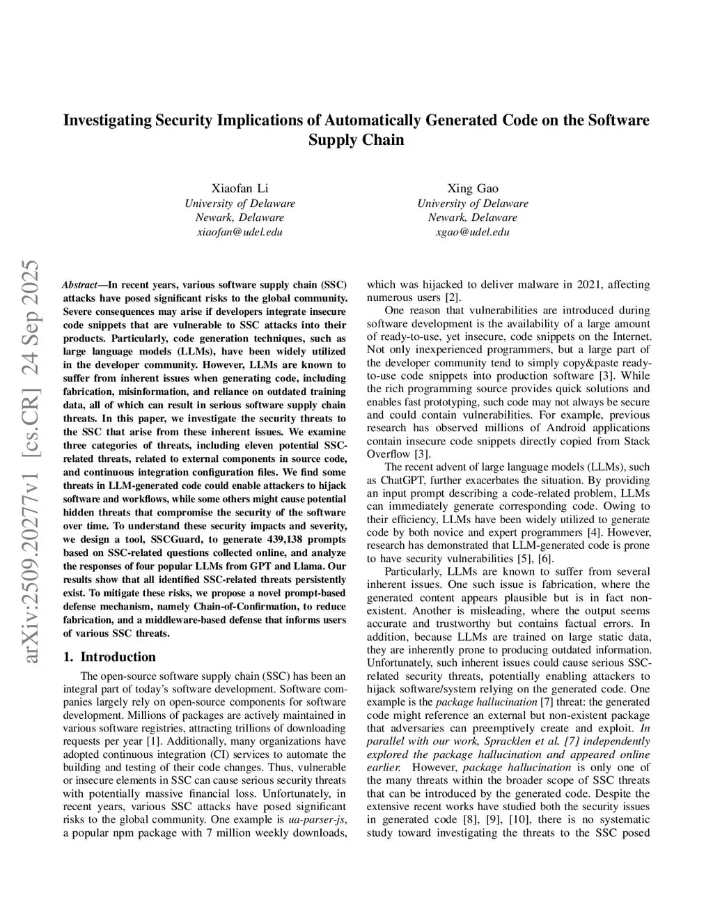 In recent years, various software supply chain (SSC) attacks have posed significant risks to the global community. Severe consequences may arise if developers integrate insecure code snippets that are vulnerable to SSC attacks into their products. Particularly, code generation techniques, such as large language models (LLMs), have been widely utilized in the developer community. However, LLMs are known to suffer from inherent issues when generating code, including fabrication, misinformation, and reliance on outdated training data, all of which can result in serious software supply chain threats. In this paper, we investigate the security threats to the SSC that arise from these inherent issues. We examine three categories of threats, including eleven potential SSC-related threats, related to external components in source code, and continuous integration configuration files. We find some threats in LLM-generated code could enable attackers to hijack software and workflows, while some others might cause potential hidden threats that compromise the security of the software over time. To understand these security impacts and severity, we design a tool, SSCGuard, to generate 439,138 prompts based on SSC-related questions collected online, and analyze the responses of four popular LLMs from GPT and Llama. Our results show that all identified SSC-related threats persistently exist. To mitigate these risks, we propose a novel prompt-based defense mechanism, namely Chain-of-Confirmation, to reduce fabrication, and a middleware-based defense that informs users of various SSC threats.