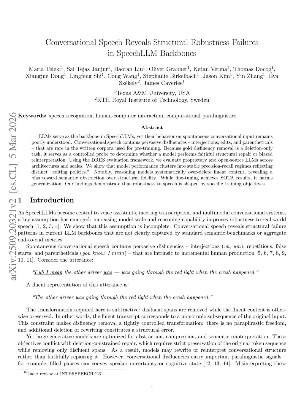 LLMs serve as the backbone in SpeechLLMs, yet their behavior on spontaneous conversational input remains poorly understood. Conversational speech contains pervasive disfluencies -- interjections, edits, and parentheticals -- that are rare in the written corpora used for pre-training. Because gold disfluency removal is a deletion-only task, it serves as a controlled probe to determine whether a model performs faithful structural repair or biased reinterpretation. Using the DRES evaluation framework, we evaluate proprietary and open-source LLMs across architectures and scales. We show that model performance clusters into stable precision-recall regimes reflecting distinct editing policies. Notably, reasoning models systematically over-delete fluent content, revealing a bias toward semantic abstraction over structural fidelity. While fine-tuning achieves SOTA results, it harms generalization. Our findings demonstrate that robustness to speech is shaped by specific training objectives.