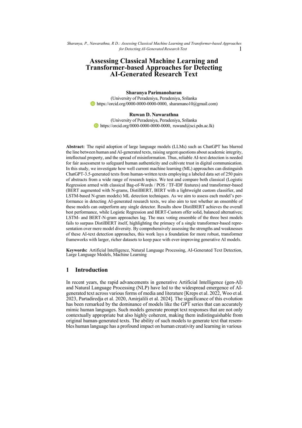The rapid adoption of large language models (LLMs) such as ChatGPT has blurred the line between human and AI-generated texts, raising urgent questions about academic integrity, intellectual property, and the spread of misinformation. Thus, reliable AI-text detection is needed for fair assessment to safeguard human authenticity and cultivate trust in digital communication. In this study, we investigate how well current machine learning (ML) approaches can distinguish ChatGPT-3.5-generated texts from human-written texts employing a labeled data set of 250 pairs of abstracts from a wide range of research topics. We test and compare both classical (Logistic Regression armed with classical Bag-of-Words, POS, and TF-IDF features) and transformer-based (BERT augmented with N-grams, DistilBERT, BERT with a lightweight custom classifier, and LSTM-based N-gram models) ML detection techniques. As we aim to assess each model's performance in detecting AI-generated research texts, we also aim to test whether an ensemble of these models can outperform any single detector. Results show DistilBERT achieves the overall best performance, while Logistic Regression and BERT-Custom offer solid, balanced alternatives; LSTM- and BERT-N-gram approaches lag. The max voting ensemble of the three best models fails to surpass DistilBERT itself, highlighting the primacy of a single transformer-based representation over mere model diversity. By comprehensively assessing the strengths and weaknesses of these AI-text detection approaches, this work lays a foundation for more robust transformer frameworks with larger, richer datasets to keep pace with ever-improving generative AI models.
