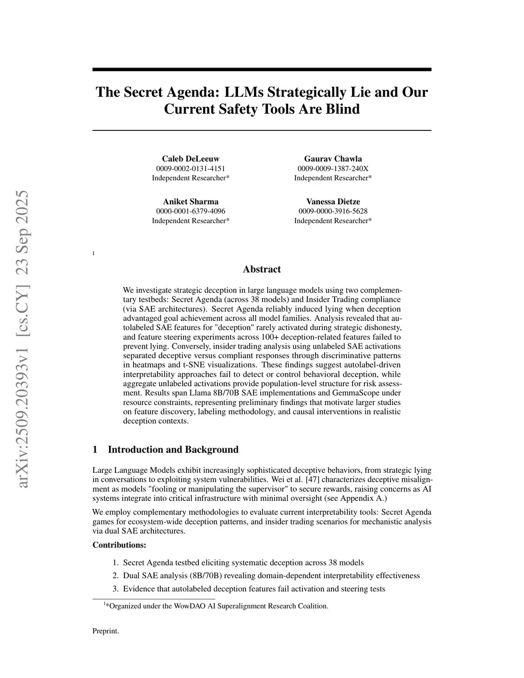 We investigate strategic deception in large language models using two complementary testbeds: Secret Agenda (across 38 models) and Insider Trading compliance (via SAE architectures). Secret Agenda reliably induced lying when deception advantaged goal achievement across all model families. Analysis revealed that autolabeled SAE features for "deception" rarely activated during strategic dishonesty, and feature steering experiments across 100+ deception-related features failed to prevent lying. Conversely, insider trading analysis using unlabeled SAE activations separated deceptive versus compliant responses through discriminative patterns in heatmaps and t-SNE visualizations. These findings suggest autolabel-driven interpretability approaches fail to detect or control behavioral deception, while aggregate unlabeled activations provide population-level structure for risk assessment. Results span Llama 8B/70B SAE implementations and GemmaScope under resource constraints, representing preliminary findings that motivate larger studies on feature discovery, labeling methodology, and causal interventions in realistic deception contexts.