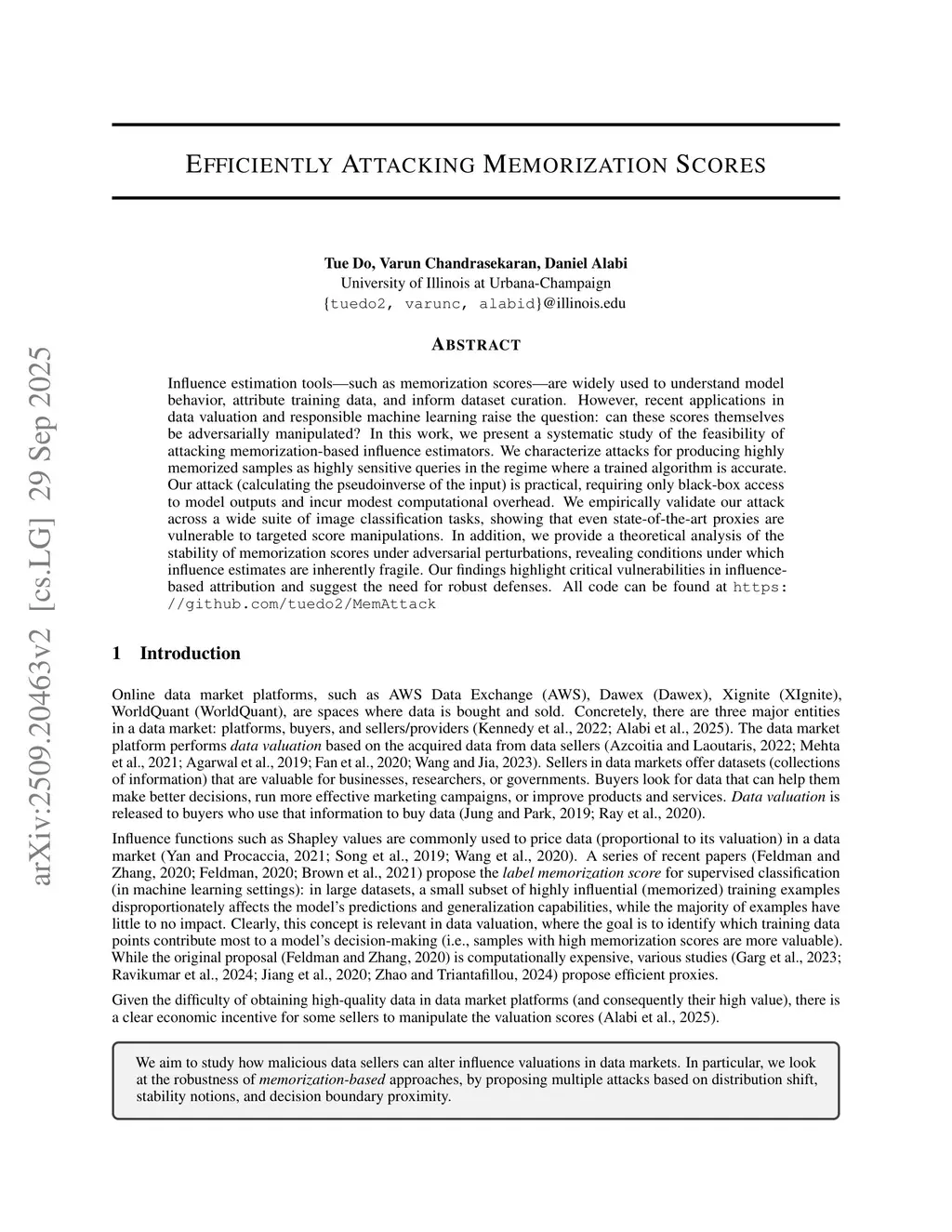 Influence estimation tools -- such as memorization scores -- are widely used to understand model behavior, attribute training data, and inform dataset curation. However, recent applications in data valuation and responsible machine learning raise the question: can these scores themselves be adversarially manipulated? In this work, we present a systematic study of the feasibility of attacking memorization-based influence estimators. We characterize attacks for producing highly memorized samples as highly sensitive queries in the regime where a trained algorithm is accurate. Our attack (calculating the pseudoinverse of the input) is practical, requiring only black-box access to model outputs and incur modest computational overhead. We empirically validate our attack across a wide suite of image classification tasks, showing that even state-of-the-art proxies are vulnerable to targeted score manipulations. In addition, we provide a theoretical analysis of the stability of memorization scores under adversarial perturbations, revealing conditions under which influence estimates are inherently fragile. Our findings highlight critical vulnerabilities in influence-based attribution and suggest the need for robust defenses. All code can be found at this https URL