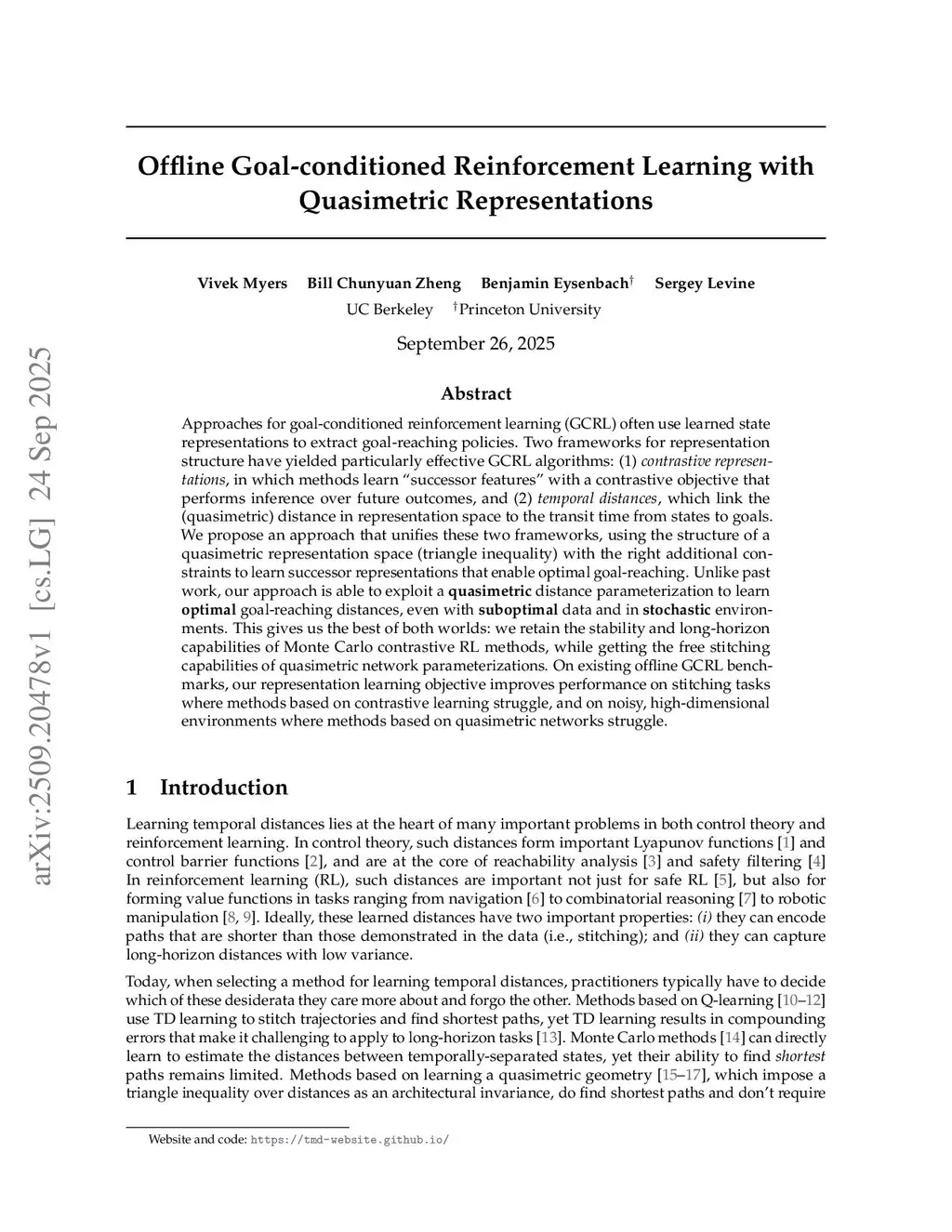 Approaches for goal-conditioned reinforcement learning (GCRL) often use learned state representations to extract goal-reaching policies. Two frameworks for representation structure have yielded particularly effective GCRL algorithms: (1) *contrastive representations*, in which methods learn "successor features" with a contrastive objective that performs inference over future outcomes, and (2) *temporal distances*, which link the (quasimetric) distance in representation space to the transit time from states to goals. We propose an approach that unifies these two frameworks, using the structure of a quasimetric representation space (triangle inequality) with the right additional constraints to learn successor representations that enable optimal goal-reaching. Unlike past work, our approach is able to exploit a **quasimetric** distance parameterization to learn **optimal** goal-reaching distances, even with **suboptimal** data and in **stochastic** environments. This gives us the best of both worlds: we retain the stability and long-horizon capabilities of Monte Carlo contrastive RL methods, while getting the free stitching capabilities of quasimetric network parameterizations. On existing offline GCRL benchmarks, our representation learning objective improves performance on stitching tasks where methods based on contrastive learning struggle, and on noisy, high-dimensional environments where methods based on quasimetric networks struggle.