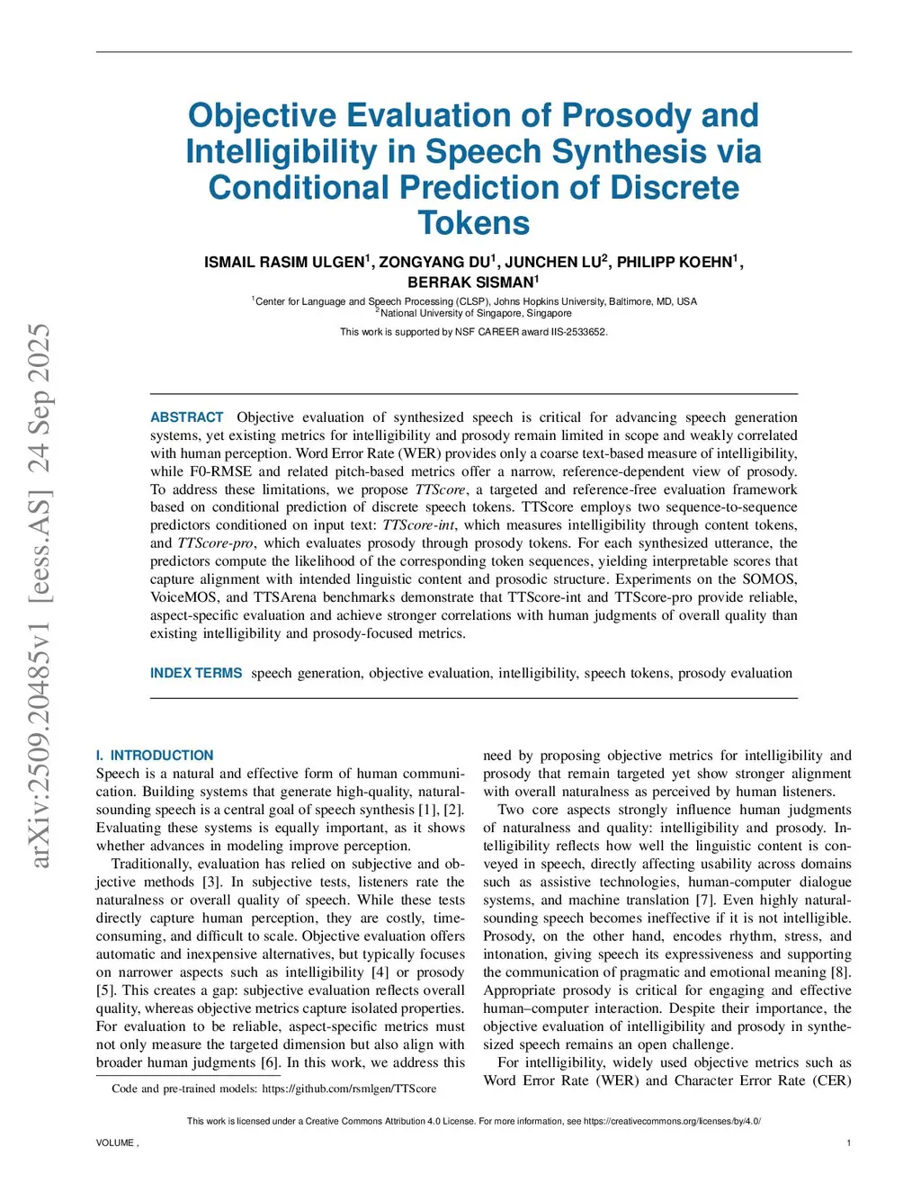 Objective evaluation of synthesized speech is critical for advancing speech generation systems, yet existing metrics for intelligibility and prosody remain limited in scope and weakly correlated with human perception. Word Error Rate (WER) provides only a coarse text-based measure of intelligibility, while F0-RMSE and related pitch-based metrics offer a narrow, reference-dependent view of prosody. To address these limitations, we propose TTScore, a targeted and reference-free evaluation framework based on conditional prediction of discrete speech tokens. TTScore employs two sequence-to-sequence predictors conditioned on input text: TTScore-int, which measures intelligibility through content tokens, and TTScore-pro, which evaluates prosody through prosody tokens. For each synthesized utterance, the predictors compute the likelihood of the corresponding token sequences, yielding interpretable scores that capture alignment with intended linguistic content and prosodic structure. Experiments on the SOMOS, VoiceMOS, and TTSArena benchmarks demonstrate that TTScore-int and TTScore-pro provide reliable, aspect-specific evaluation and achieve stronger correlations with human judgments of overall quality than existing intelligibility and prosody-focused metrics.