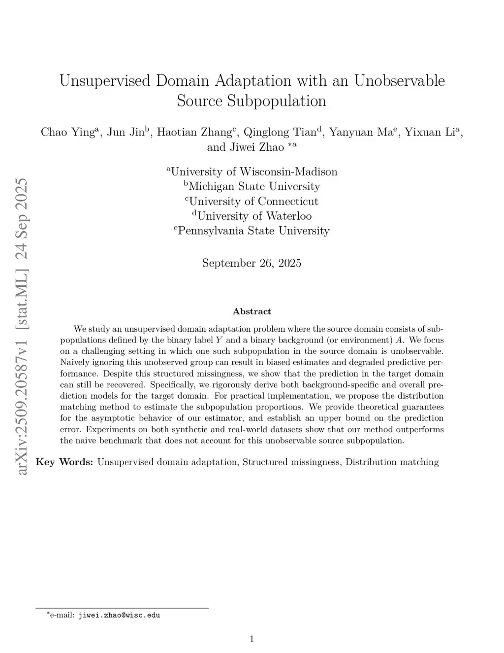 We study an unsupervised domain adaptation problem where the source domain consists of subpopulations defined by the binary label and a binary background (or environment) . We focus on a challenging setting in which one such subpopulation in the source domain is unobservable. Naively ignoring this unobserved group can result in biased estimates and degraded predictive performance. Despite this structured missingness, we show that the prediction in the target domain can still be recovered. Specifically, we rigorously derive both background-specific and overall prediction models for the target domain. For practical implementation, we propose the distribution matching method to estimate the subpopulation proportions. We provide theoretical guarantees for the asymptotic behavior of our estimator, and establish an upper bound on the prediction error. Experiments on both synthetic and real-world datasets show that our method outperforms the naive benchmark that does not account for this unobservable source subpopulation.
