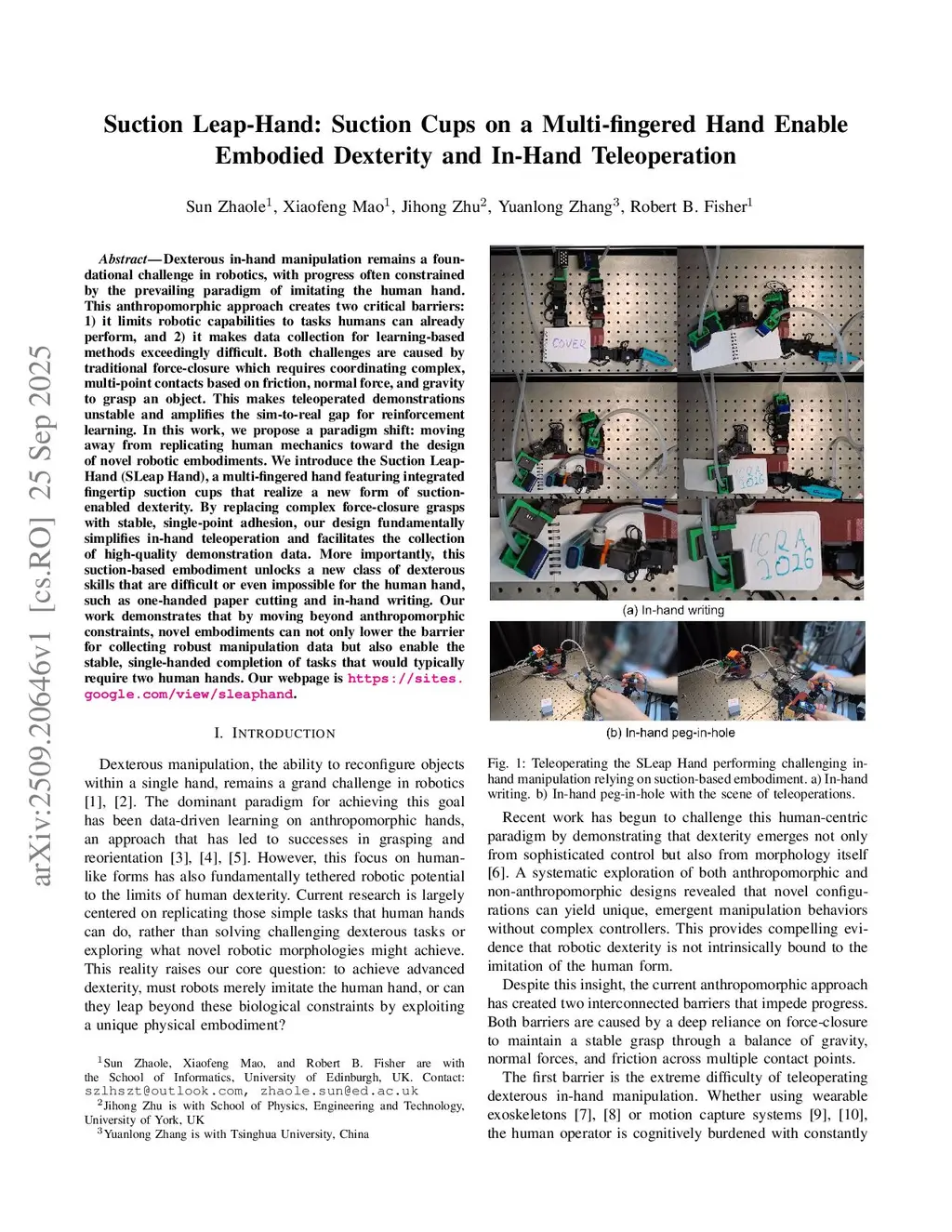 Dexterous in-hand manipulation remains a foundational challenge in robotics, with progress often constrained by the prevailing paradigm of imitating the human hand. This anthropomorphic approach creates two critical barriers: 1) it limits robotic capabilities to tasks humans can already perform, and 2) it makes data collection for learning-based methods exceedingly difficult. Both challenges are caused by traditional force-closure which requires coordinating complex, multi-point contacts based on friction, normal force, and gravity to grasp an object. This makes teleoperated demonstrations unstable and amplifies the sim-to-real gap for reinforcement learning. In this work, we propose a paradigm shift: moving away from replicating human mechanics toward the design of novel robotic embodiments. We introduce the \textbf{S}uction \textbf{Leap}-Hand (SLeap Hand), a multi-fingered hand featuring integrated fingertip suction cups that realize a new form of suction-enabled dexterity. By replacing complex force-closure grasps with stable, single-point adhesion, our design fundamentally simplifies in-hand teleoperation and facilitates the collection of high-quality demonstration data. More importantly, this suction-based embodiment unlocks a new class of dexterous skills that are difficult or even impossible for the human hand, such as one-handed paper cutting and in-hand writing. Our work demonstrates that by moving beyond anthropomorphic constraints, novel embodiments can not only lower the barrier for collecting robust manipulation data but also enable the stable, single-handed completion of tasks that would typically require two human hands. Our webpage isthis https URL.