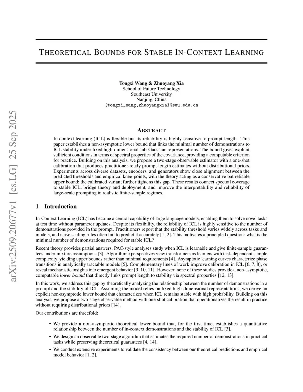 In-context learning (ICL) is flexible but its reliability is highly sensitive to prompt length. This paper establishes a non-asymptotic lower bound that links the minimal number of demonstrations to ICL stability under fixed high-dimensional sub-Gaussian representations. The bound gives explicit sufficient conditions in terms of spectral properties of the covariance, providing a computable criterion for practice. Building on this analysis, we propose a two-stage observable estimator with a one-shot calibration that produces practitioner-ready prompt-length estimates without distributional priors. Experiments across diverse datasets, encoders, and generators show close alignment between the predicted thresholds and empirical knee-points, with the theory acting as a conservative but reliable upper bound; the calibrated variant further tightens this gap. These results connect spectral coverage to stable ICL, bridge theory and deployment, and improve the interpretability and reliability of large-scale prompting in realistic finite-sample regimes.