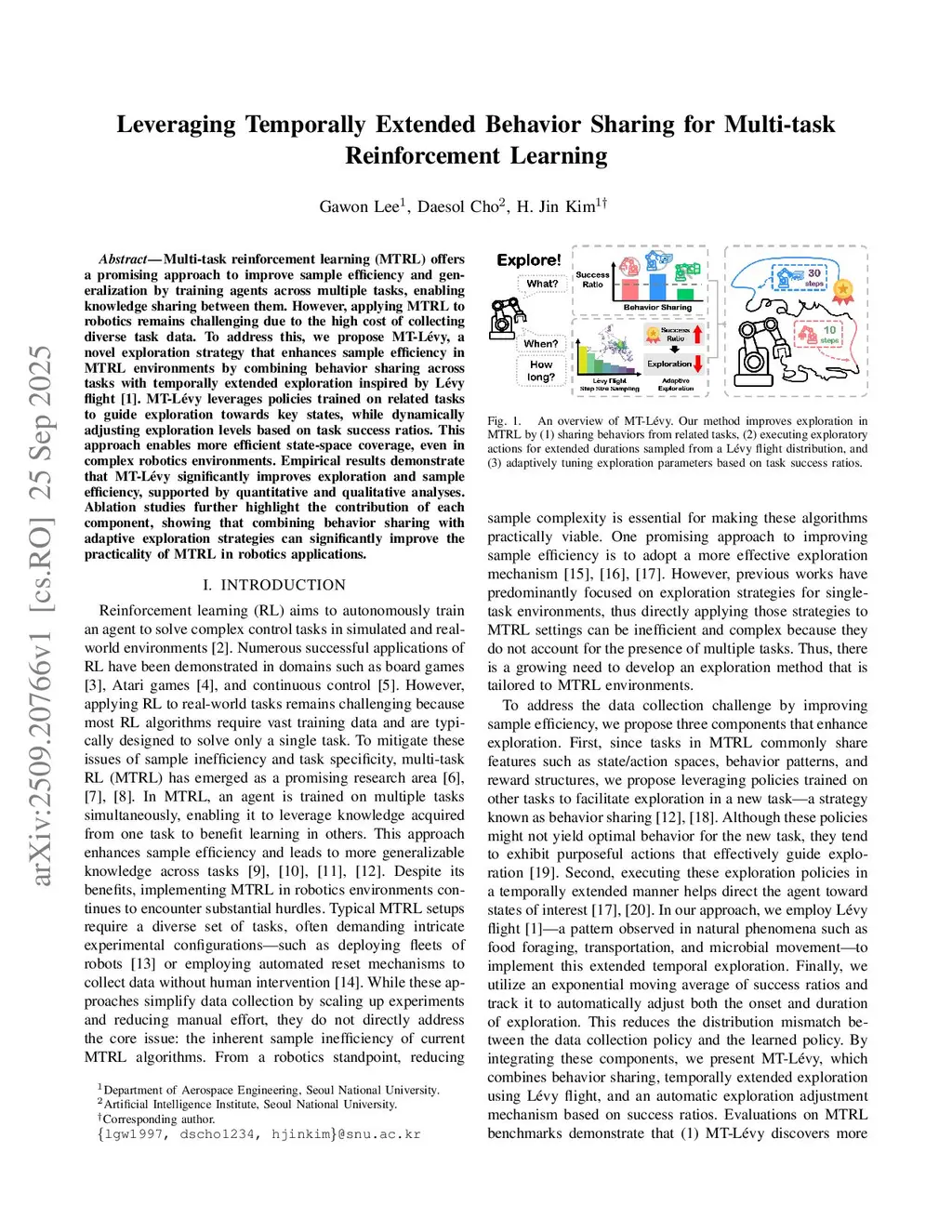 Multi-task reinforcement learning (MTRL) offers a promising approach to improve sample efficiency and generalization by training agents across multiple tasks, enabling knowledge sharing between them. However, applying MTRL to robotics remains challenging due to the high cost of collecting diverse task data. To address this, we propose MT-Lévy, a novel exploration strategy that enhances sample efficiency in MTRL environments by combining behavior sharing across tasks with temporally extended exploration inspired by Lévy flight. MT-Lévy leverages policies trained on related tasks to guide exploration towards key states, while dynamically adjusting exploration levels based on task success ratios. This approach enables more efficient state-space coverage, even in complex robotics environments. Empirical results demonstrate that MT-Lévy significantly improves exploration and sample efficiency, supported by quantitative and qualitative analyses. Ablation studies further highlight the contribution of each component, showing that combining behavior sharing with adaptive exploration strategies can significantly improve the practicality of MTRL in robotics applications.
