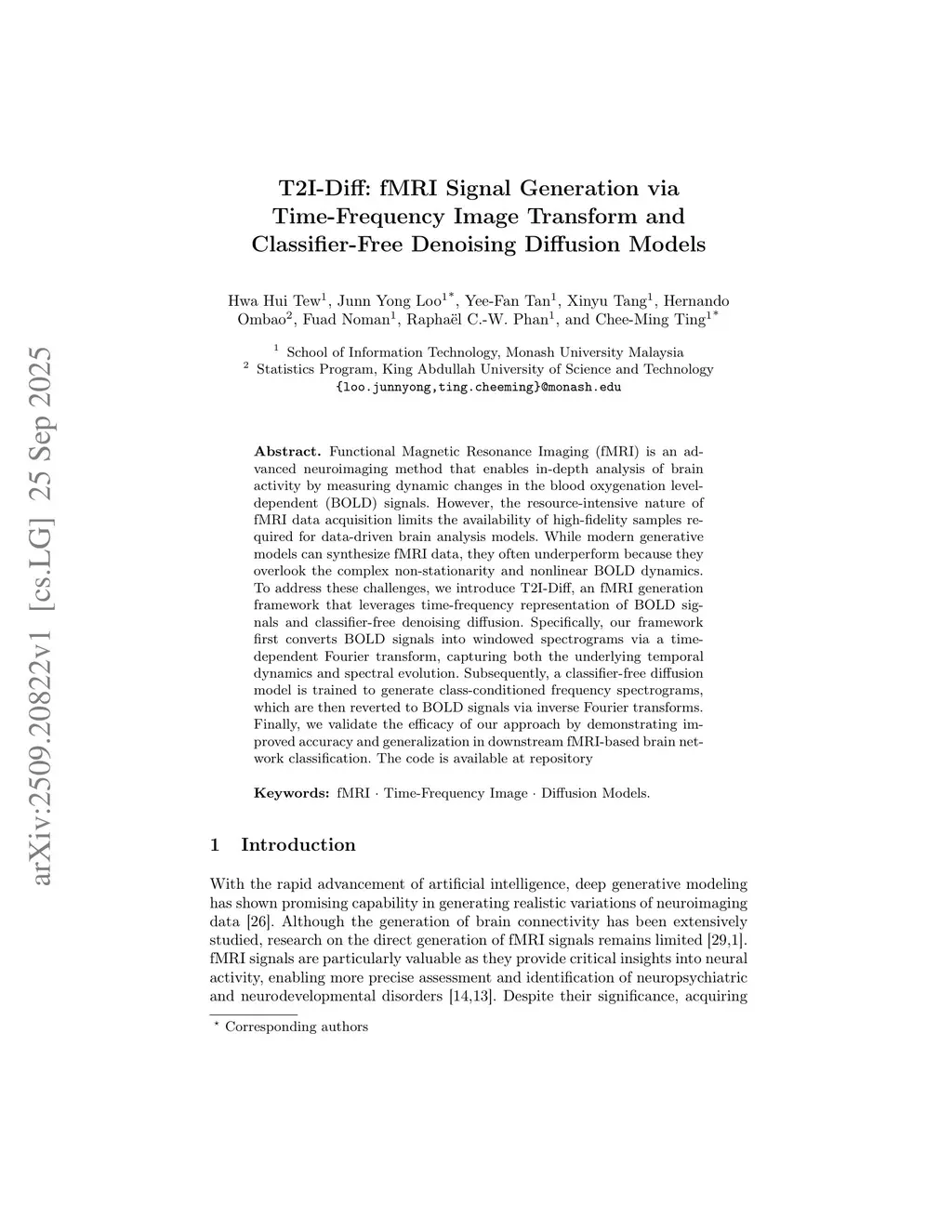 T2I-Diff: fMRI Signal Generation via Time-Frequency Image Transform and Classifier-Free Denoising Diffusion Models