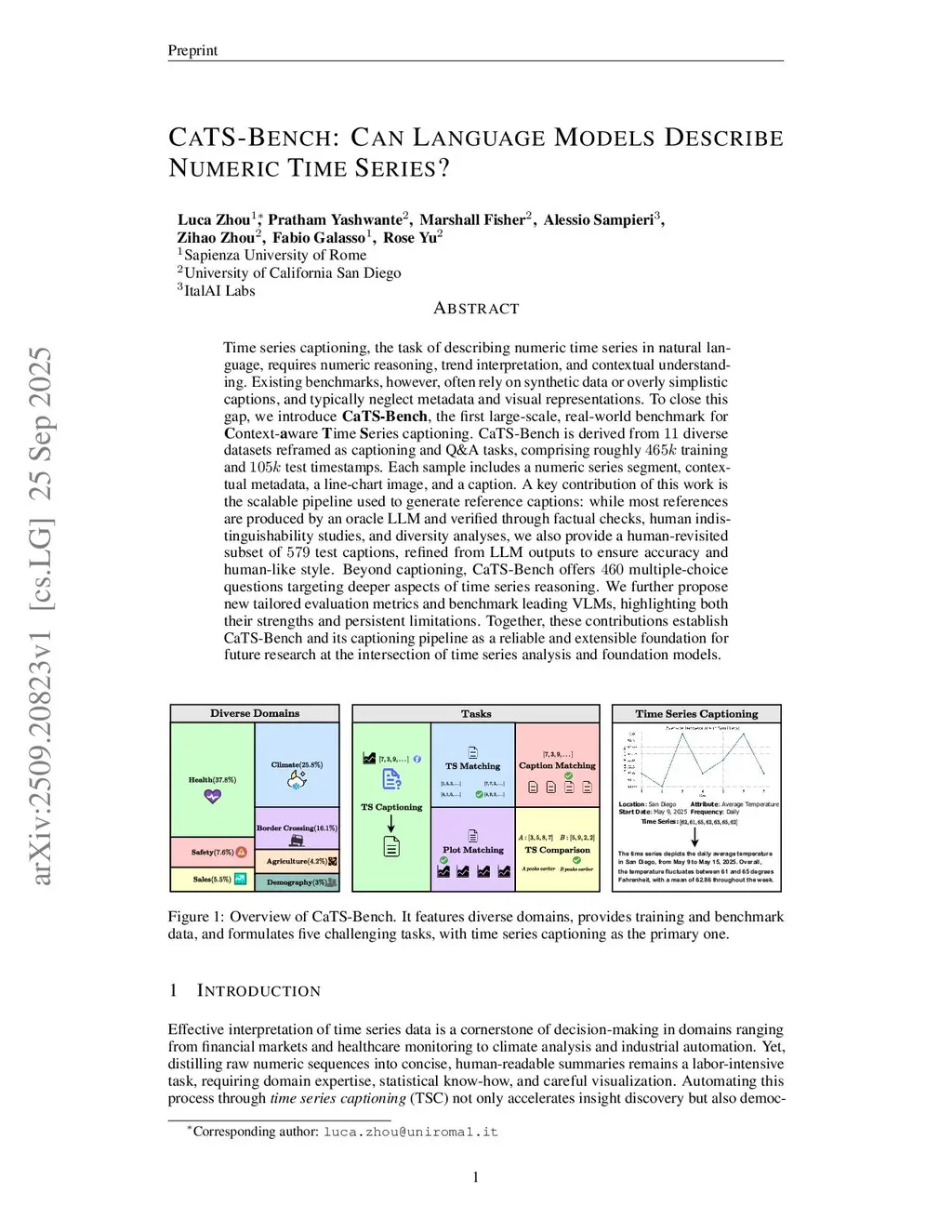 Time series captioning, the task of describing time series in natural language, requires numeric and temporal reasoning, trend interpretation, and contextual understanding. Existing benchmarks, however, often rely on fully synthetic or generic captions, and typically neglect metadata and visual representations. We introduce CaTS-Bench, a comprehensive benchmark for Context-aware Time Series reasoning across diverse domains, centered on a gold-standard evaluation set of human-rewritten captions that measure how effectively models translate numeric trends into immediately interpretable narratives. To address the scarcity of human-annotated data, we also propose a scalable pipeline for generating high-fidelity synthetic captions, the quality of which we validate. We evaluate leading Vision-Language Models on our benchmark, revealing that even proprietary models struggle to capture numeric nuances in temporal descriptions, while finetuning open-source models on synthetic data yields substantial performance gains. Finally, we release a diagnostic suite of multiple-choice questions and tailored numeric metrics to gauge time-series-specific reasoning capabilities, establishing CaTS-Bench as a reliable foundation for grounded, multimodal language generation in numeric domains.