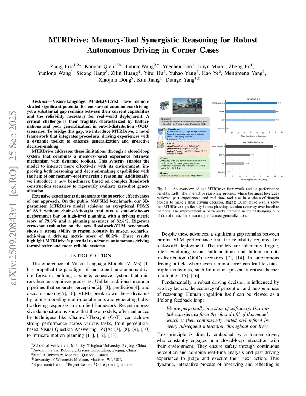 Vision-Language Models(VLMs) have demonstrated significant potential for end-to-end autonomous driving, yet a substantial gap remains between their current capabilities and the reliability necessary for real-world deployment. A critical challenge is their fragility, characterized by hallucinations and poor generalization in out-of-distribution (OOD) scenarios. To bridge this gap, we introduce MTRDrive, a novel framework that integrates procedural driving experiences with a dynamic toolkit to enhance generalization and proactive decision-making.MTRDrive addresses these limitations through a closed-loop system that combines a memory-based experience retrieval mechanism with dynamic toolkits. This synergy enables the model to interact more effectively with its environment, improving both reasoning and decision-making capabilities with the help of our memory-tool synergistic reasoning. Additionally, we introduce a new benchmark based on complex Roadwork construction scenarios to rigorously evaluate zero-shot generalization.Extensive experiments demonstrate the superior effectiveness of our approach. On the public NAVSIM benchmark, our 3B-parameter MTRDrive model achieves an exceptional PDMS of 88.3 without chain-of-thought and sets a state-of-the-art performance bar on high-level planning, with a driving metric score of 79.8\% and a planning accuracy of 82.6\%. Rigorous zero-shot evaluation on the new Roadwork-VLM benchmark shows a strong ability to reason robustly in unseen scenarios, achieving a driving metric score of 80.2\%. These results highlight MTRDrive's potential to advance autonomous driving toward safer and more reliable systems.