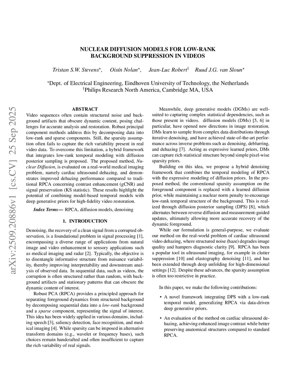 Video sequences often contain structured noise and background artifacts that obscure dynamic content, posing challenges for accurate analysis and restoration. Robust principal component methods address this by decomposing data into low-rank and sparse components. Still, the sparsity assumption often fails to capture the rich variability present in real video data. To overcome this limitation, a hybrid framework that integrates low-rank temporal modeling with diffusion posterior sampling is proposed. The proposed method, Nuclear Diffusion, is evaluated on a real-world medical imaging problem, namely cardiac ultrasound dehazing, and demonstrates improved dehazing performance compared to traditional RPCA concerning contrast enhancement (gCNR) and signal preservation (KS statistic). These results highlight the potential of combining model-based temporal models with deep generative priors for high-fidelity video restoration.