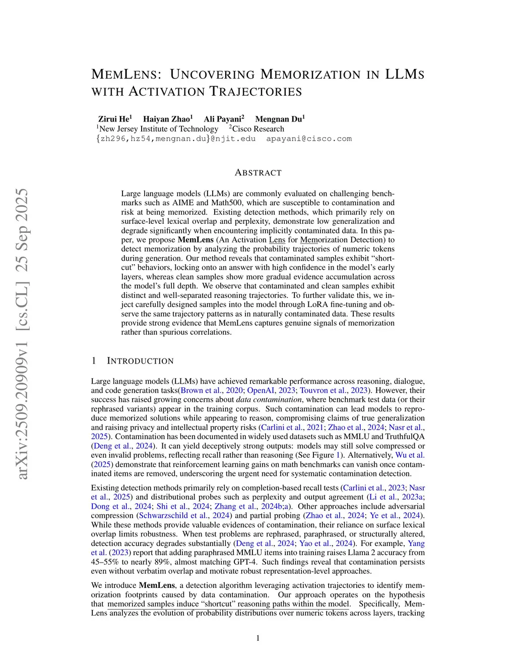 Large language models (LLMs) are commonly evaluated on challenging benchmarks such as AIME and Math500, which are susceptible to contamination and risk of being memorized. Existing detection methods, which primarily rely on surface-level lexical overlap and perplexity, demonstrate low generalization and degrade significantly when encountering implicitly contaminated data. In this paper, we propose MemLens (An Activation Lens for Memorization Detection) to detect memorization by analyzing the probability trajectories of numeric tokens during generation. Our method reveals that contaminated samples exhibit ``shortcut'' behaviors, locking onto an answer with high confidence in the model's early layers, whereas clean samples show more gradual evidence accumulation across the model's full depth. We observe that contaminated and clean samples exhibit distinct and well-separated reasoning trajectories. To further validate this, we inject carefully designed samples into the model through LoRA fine-tuning and observe the same trajectory patterns as in naturally contaminated data. These results provide strong evidence that MemLens captures genuine signals of memorization rather than spurious correlations.