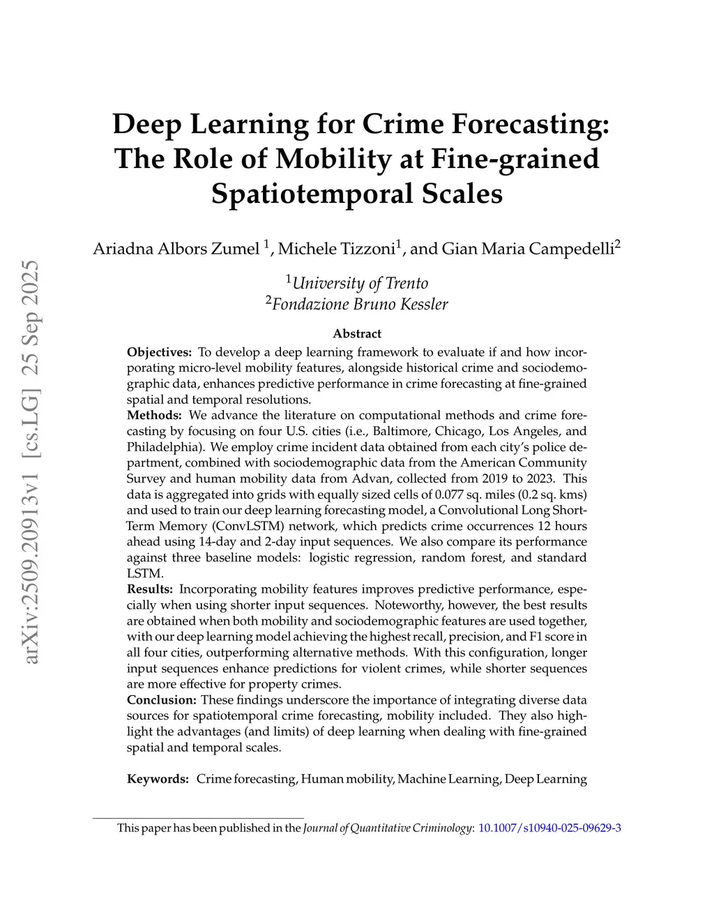 Objectives: To develop a deep learning framework to evaluate if and how incorporating micro-level mobility features, alongside historical crime and sociodemographic data, enhances predictive performance in crime forecasting at fine-grained spatial and temporal resolutions.Methods: We advance the literature on computational methods and crime forecasting by focusing on four U.S. cities (i.e., Baltimore, Chicago, Los Angeles, and Philadelphia). We employ crime incident data obtained from each city's police department, combined with sociodemographic data from the American Community Survey and human mobility data from Advan, collected from 2019 to 2023. This data is aggregated into grids with equally sized cells of 0.077 sq. miles (0.2 sq. kms) and used to train our deep learning forecasting model, a Convolutional Long Short-Term Memory (ConvLSTM) network, which predicts crime occurrences 12 hours ahead using 14-day and 2-day input sequences. We also compare its performance against three baseline models: logistic regression, random forest, and standard LSTM.Results: Incorporating mobility features improves predictive performance, especially when using shorter input sequences. Noteworthy, however, the best results are obtained when both mobility and sociodemographic features are used together, with our deep learning model achieving the highest recall, precision, and F1 score in all four cities, outperforming alternative methods. With this configuration, longer input sequences enhance predictions for violent crimes, while shorter sequences are more effective for property crimes.Conclusion: These findings underscore the importance of integrating diverse data sources for spatiotemporal crime forecasting, mobility included. They also highlight the advantages (and limits) of deep learning when dealing with fine-grained spatial and temporal scales.