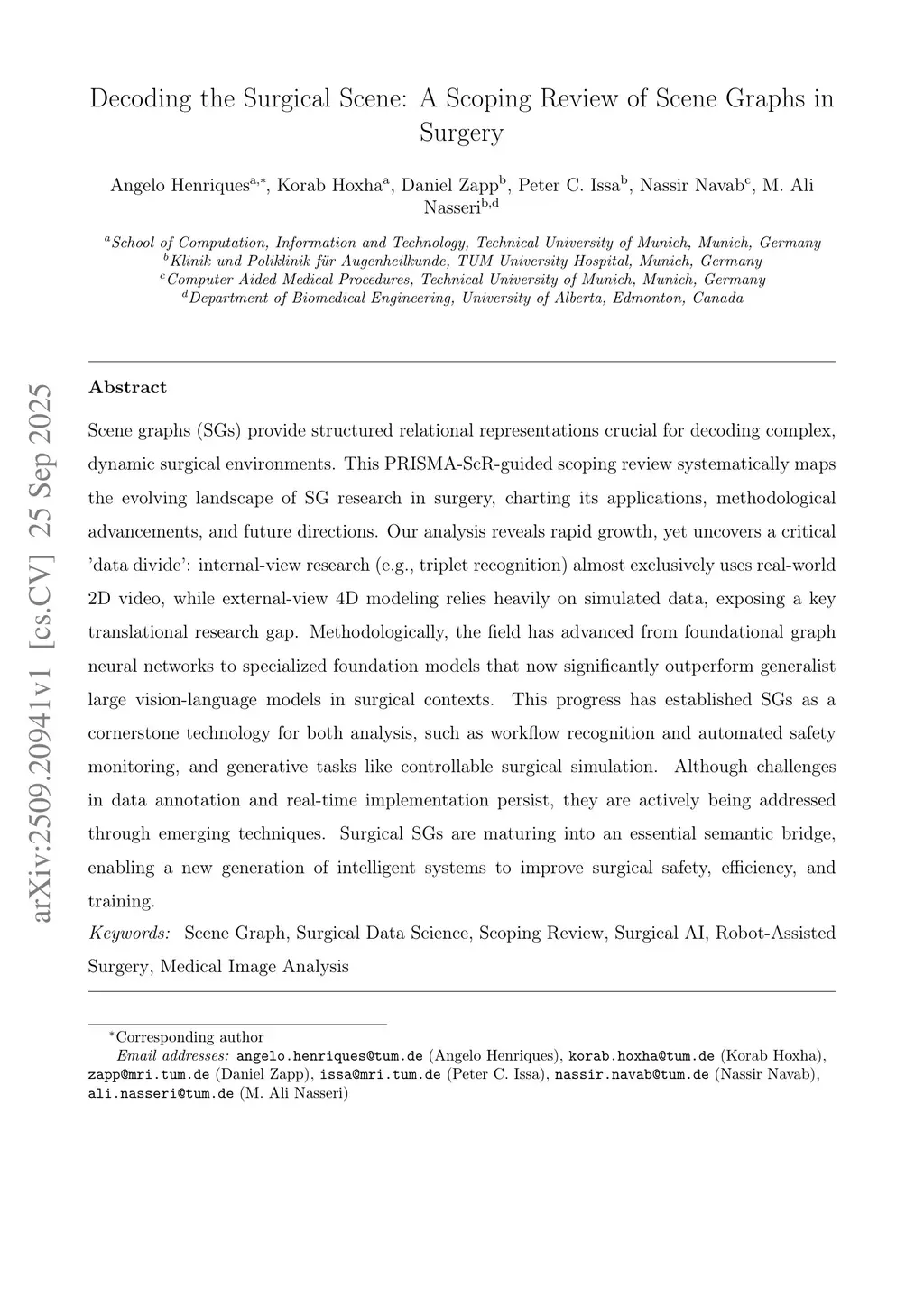 Scene graphs (SGs) provide structured relational representations crucial for decoding complex, dynamic surgical environments. This PRISMA-ScR-guided scoping review systematically maps the evolving landscape of SG research in surgery, charting its applications, methodological advancements, and future directions. Our analysis reveals rapid growth, yet uncovers a critical 'data divide': internal-view research (e.g., triplet recognition) almost exclusively uses real-world 2D video, while external-view 4D modeling relies heavily on simulated data, exposing a key translational research gap. Methodologically, the field has advanced from foundational graph neural networks to specialized foundation models that now significantly outperform generalist large vision-language models in surgical contexts. This progress has established SGs as a cornerstone technology for both analysis, such as workflow recognition and automated safety monitoring, and generative tasks like controllable surgical simulation. Although challenges in data annotation and real-time implementation persist, they are actively being addressed through emerging techniques. Surgical SGs are maturing into an essential semantic bridge, enabling a new generation of intelligent systems to improve surgical safety, efficiency, and training.