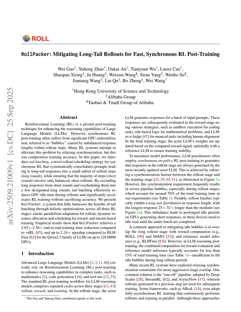 Reinforcement Learning (RL) is a pivotal post-training technique for enhancing the reasoning capabilities of Large Language Models (LLMs). However, synchronous RL post-training often suffers from significant GPU underutilization, referred to as bubbles, caused by imbalanced response lengths within rollout steps. Many RL systems attempt to alleviate this problem by relaxing synchronization, but this can compromise training accuracy. In this paper, we introduce tail batching, a novel rollout scheduling strategy for synchronous RL that systematically consolidates prompts leading to long-tail responses into a small subset of rollout steps (long rounds), while ensuring that the majority of steps (short rounds) involve only balanced, short rollouts. By excluding long responses from short rounds and rescheduling them into a few designated long rounds, tail batching effectively reduces GPU idle time during rollouts and significantly accelerates RL training without sacrificing accuracy. We present RollPacker, a system that fully harnesses the benefits of tail batching through holistic optimizations across all three RL stages: elastic parallelism adaptation for rollout, dynamic resource allocation and scheduling for reward, and stream-based training. Empirical results show that RollPacker achieves a 2.03x-2.56x end-to-end training time reduction compared to veRL and up to 2.24x speedup compared to RLHFuse for the Qwen2.5 family of LLMs on up to 128 H800 GPUs.