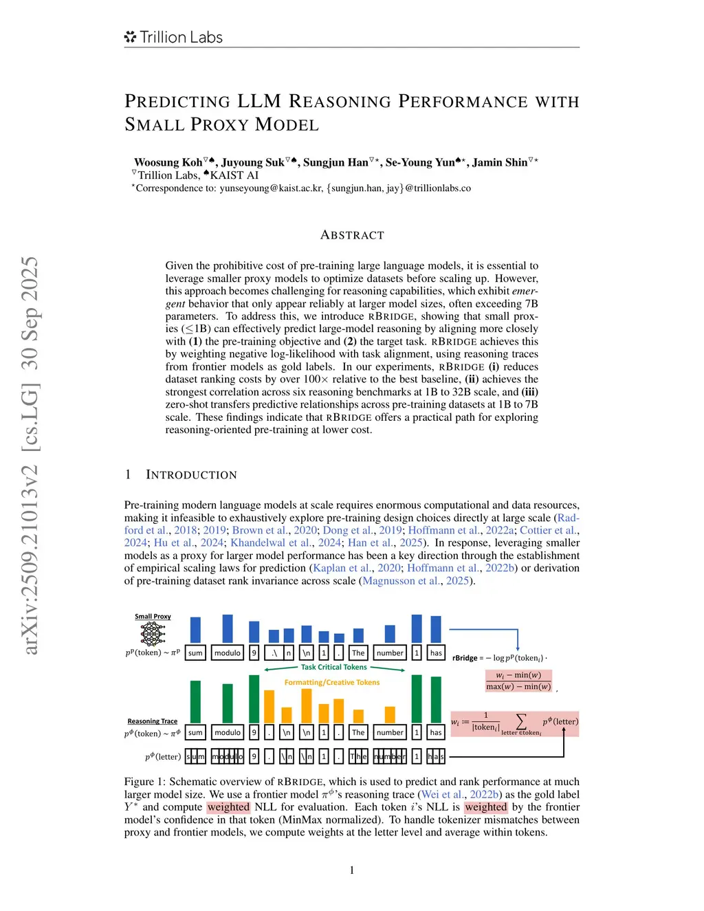 Given the prohibitive cost of pre-training large language models, it is essential to leverage smaller proxy models to optimize datasets before scaling up. However, this approach becomes challenging for reasoning capabilities, which exhibit emergent behavior that only appear reliably at larger model sizes, often exceeding 7B parameters. To address this, we introduce rBridge, showing that small proxies (1B) can effectively predict large-model reasoning by aligning more closely with (1) the pre-training objective and (2) the target task. rBridge achieves this by weighting negative log-likelihood with task alignment, using reasoning traces from frontier models as gold labels. In our experiments, rBridge (i) reduces dataset ranking costs by over 100x relative to the best baseline, (ii) achieves the strongest correlation across six reasoning benchmarks at 1B to 32B scale, and (iii) zero-shot transfers predictive relationships across pre-training datasets at 1B to 7B scale. These findings indicate that rBridge offers a practical path for exploring reasoning-oriented pre-training at lower cost.