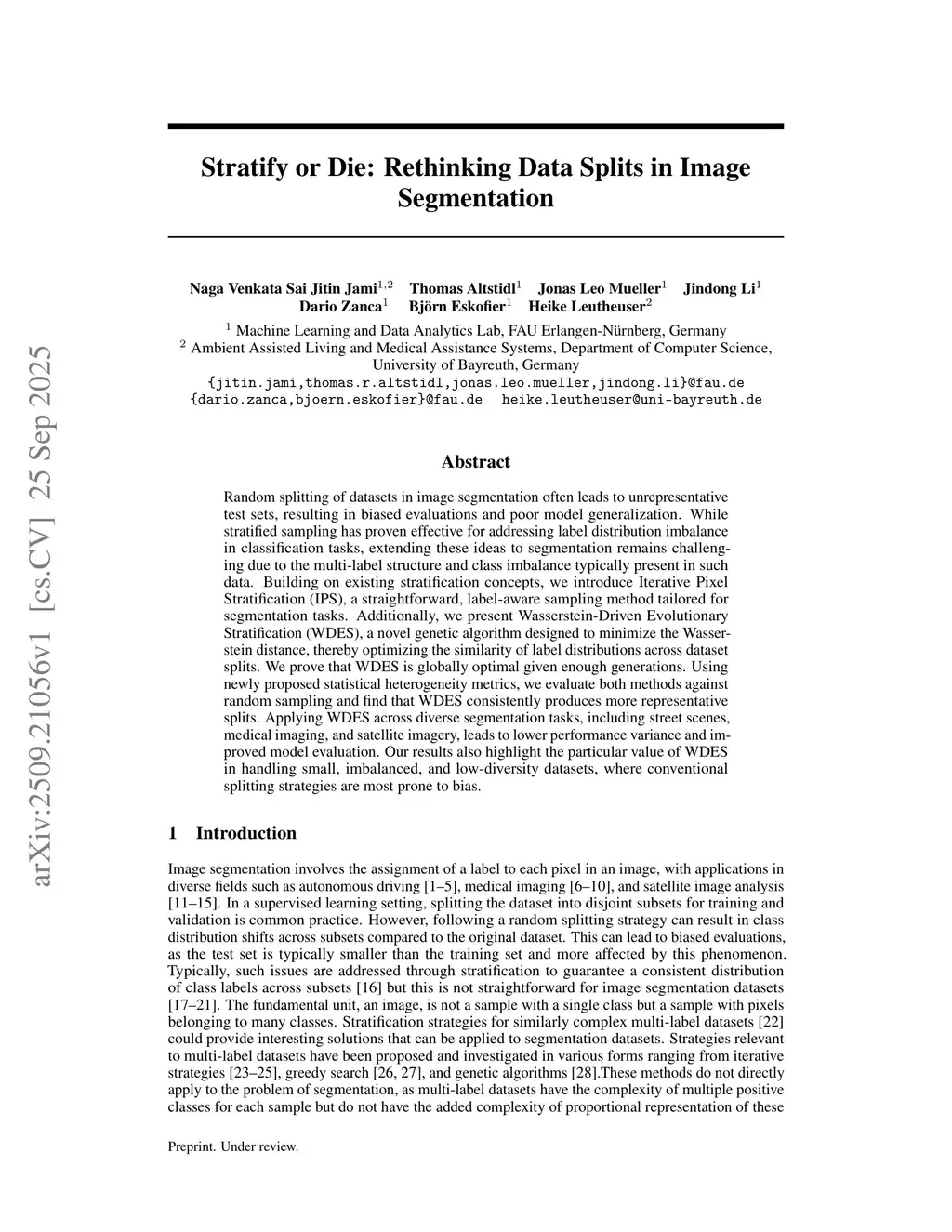 Random splitting of datasets in image segmentation often leads to unrepresentative test sets, resulting in biased evaluations and poor model generalization. While stratified sampling has proven effective for addressing label distribution imbalance in classification tasks, extending these ideas to segmentation remains challenging due to the multi-label structure and class imbalance typically present in such data. Building on existing stratification concepts, we introduce Iterative Pixel Stratification (IPS), a straightforward, label-aware sampling method tailored for segmentation tasks. Additionally, we present Wasserstein-Driven Evolutionary Stratification (WDES), a novel genetic algorithm designed to minimize the Wasserstein distance, thereby optimizing the similarity of label distributions across dataset splits. We prove that WDES is globally optimal given enough generations. Using newly proposed statistical heterogeneity metrics, we evaluate both methods against random sampling and find that WDES consistently produces more representative splits. Applying WDES across diverse segmentation tasks, including street scenes, medical imaging, and satellite imagery, leads to lower performance variance and improved model evaluation. Our results also highlight the particular value of WDES in handling small, imbalanced, and low-diversity datasets, where conventional splitting strategies are most prone to bias.