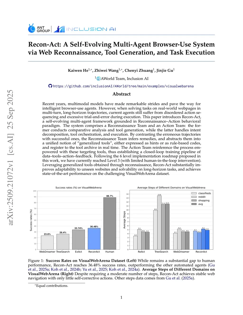 Recent years, multimodal models have made remarkable strides and pave the way for intelligent browser use agents. However, when solving tasks on real world webpages in multi-turn, long-horizon trajectories, current agents still suffer from disordered action sequencing and excessive trial and error during execution. This paper introduces Recon-Act, a self-evolving multi-agent framework grounded in Reconnaissance-Action behavioral paradigm. The system comprises a Reconnaissance Team and an Action Team: the former conducts comparative analysis and tool generation, while the latter handles intent decomposition, tool orchestration, and execution. By contrasting the erroneous trajectories with successful ones, the Reconnaissance Team infers remedies, and abstracts them into a unified notion of generalized tools, either expressed as hints or as rule-based codes, and register to the tool archive in real time. The Action Team reinference the process empowered with these targeting tools, thus establishing a closed-loop training pipeline of data-tools-action-feedback. Following the 6 level implementation roadmap proposed in this work, we have currently reached Level 3 (with limited human-in-the-loop intervention). Leveraging generalized tools obtained through reconnaissance, Recon-Act substantially improves adaptability to unseen websites and solvability on long-horizon tasks, and achieves state-of-the-art performance on the challenging VisualWebArena dataset.
