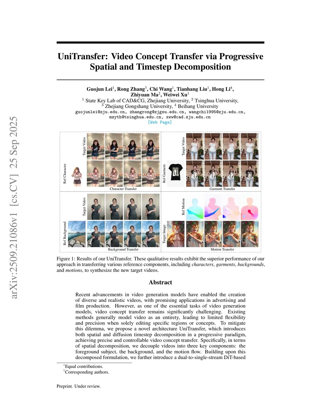 We propose a novel architecture UniTransfer, which introduces both spatial and diffusion timestep decomposition in a progressive paradigm, achieving precise and controllable video concept transfer. Specifically, in terms of spatial decomposition, we decouple videos into three key components: the foreground subject, the background, and the motion flow. Building upon this decomposed formulation, we further introduce a dual-to-single-stream DiT-based architecture for supporting fine-grained control over different components in the videos. We also introduce a self-supervised pretraining strategy based on random masking to enhance the decomposed representation learning from large-scale unlabeled video data. Inspired by the Chain-of-Thought reasoning paradigm, we further revisit the denoising diffusion process and propose a Chain-of-Prompt (CoP) mechanism to achieve the timestep decomposition. We decompose the denoising process into three stages of different granularity and leverage large language models (LLMs) for stage-specific instructions to guide the generation progressively. We also curate an animal-centric video dataset called OpenAnimal to facilitate the advancement and benchmarking of research in video concept transfer. Extensive experiments demonstrate that our method achieves high-quality and controllable video concept transfer across diverse reference images and scenes, surpassing existing baselines in both visual fidelity and editability. Web Page:this https URL