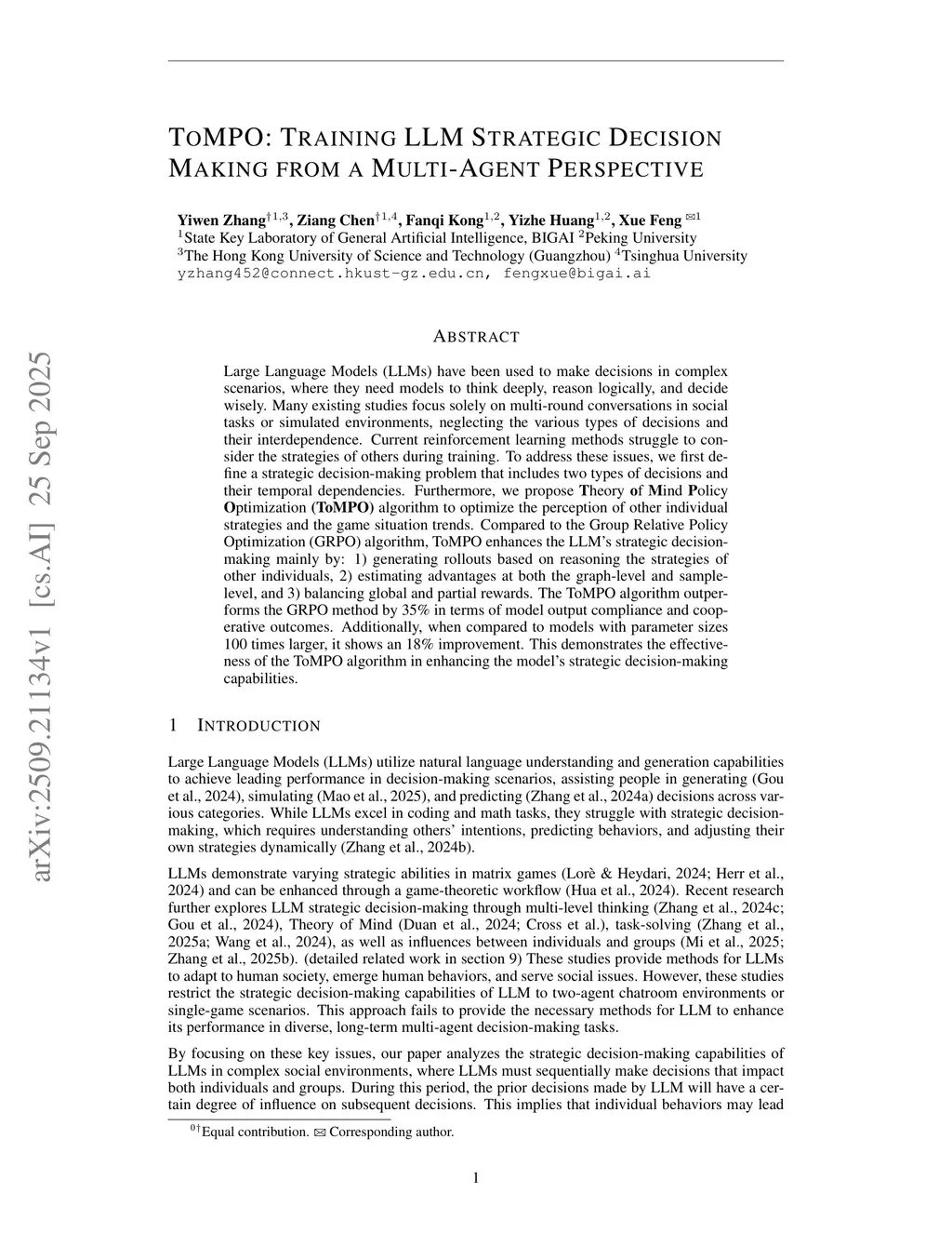 Large Language Models (LLMs) have been used to make decisions in complex scenarios, where they need models to think deeply, reason logically, and decide wisely. Many existing studies focus solely on multi-round conversations in social tasks or simulated environments, neglecting the various types of decisions and their interdependence. Current reinforcement learning methods struggle to consider the strategies of others during training. To address these issues, we first define a strategic decision-making problem that includes two types of decisions and their temporal dependencies. Furthermore, we propose **T**heory **o**f **M**ind **P**olicy **O**ptimization **(ToMPO)** algorithm to optimize the perception of other individual strategies and the game situation trends. Compared to the Group Relative Policy Optimization (GRPO) algorithm, ToMPO enhances the LLM's strategic decision-making mainly by: 1) generating rollouts based on reasoning the strategies of other individuals, 2) estimating advantages at both the graph-level and sample-level, and 3) balancing global and partial rewards. The ToMPO algorithm outperforms the GRPO method by 35% in terms of model output compliance and cooperative outcomes. Additionally, when compared to models with parameter sizes 100 times larger, it shows an 18% improvement. This demonstrates the effectiveness of the ToMPO algorithm in enhancing the model's strategic decision-making capabilities.