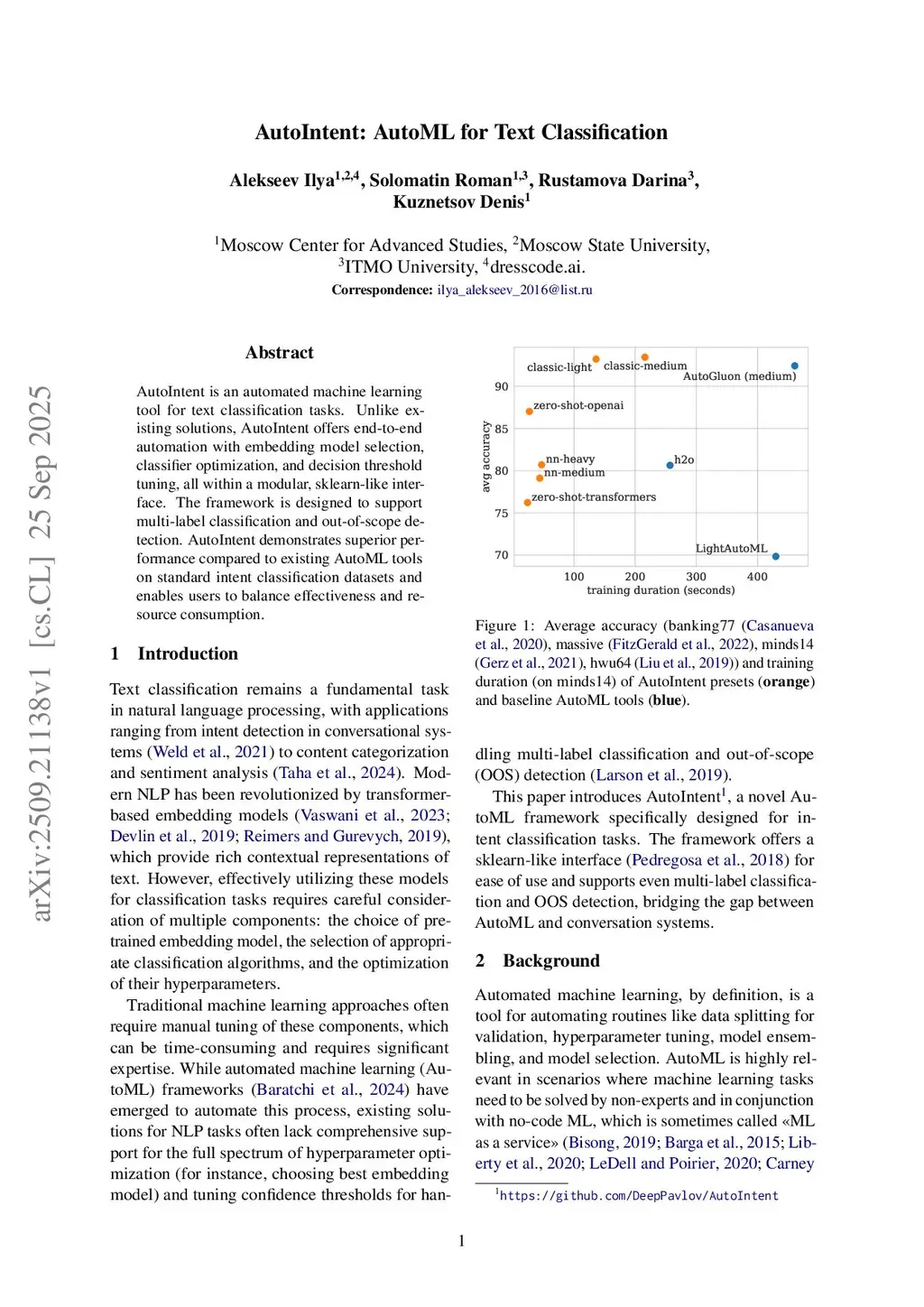 AutoIntent is an automated machine learning tool for text classification tasks. Unlike existing solutions, AutoIntent offers end-to-end automation with embedding model selection, classifier optimization, and decision threshold tuning, all within a modular, sklearn-like interface. The framework is designed to support multi-label classification and out-of-scope detection. AutoIntent demonstrates superior performance compared to existing AutoML tools on standard intent classification datasets and enables users to balance effectiveness and resource consumption.