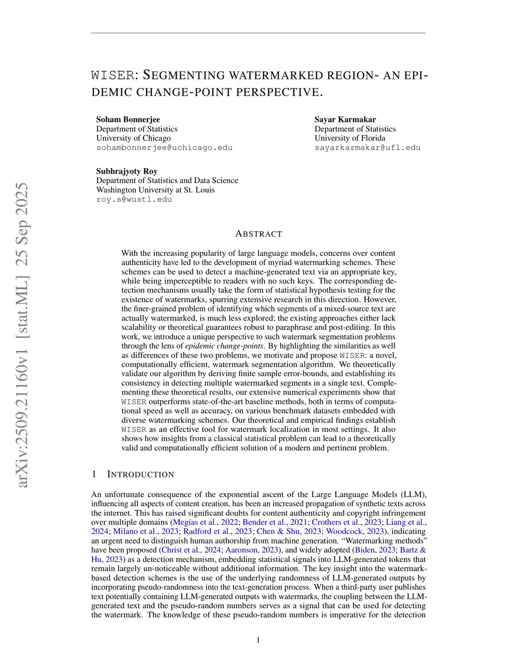 With the increasing popularity of large language models, concerns over content authenticity have led to the development of myriad watermarking schemes. These schemes can be used to detect a machine-generated text via an appropriate key, while being imperceptible to readers with no such keys. The corresponding detection mechanisms usually take the form of statistical hypothesis testing for the existence of watermarks, spurring extensive research in this direction. However, the finer-grained problem of identifying which segments of a mixed-source text are actually watermarked, is much less explored; the existing approaches either lack scalability or theoretical guarantees robust to paraphrase and post-editing. In this work, we introduce a unique perspective to such watermark segmentation problems through the lens of epidemic change-points. By highlighting the similarities as well as differences of these two problems, we motivate and propose WISER: a novel, computationally efficient, watermark segmentation algorithm. We theoretically validate our algorithm by deriving finite sample error-bounds, and establishing its consistency in detecting multiple watermarked segments in a single text. Complementing these theoretical results, our extensive numerical experiments show that WISER outperforms state-of-the-art baseline methods, both in terms of computational speed as well as accuracy, on various benchmark datasets embedded with diverse watermarking schemes. Our theoretical and empirical findings establish WISER as an effective tool for watermark localization in most settings. It also shows how insights from a classical statistical problem can lead to a theoretically valid and computationally efficient solution of a modern and pertinent problem.