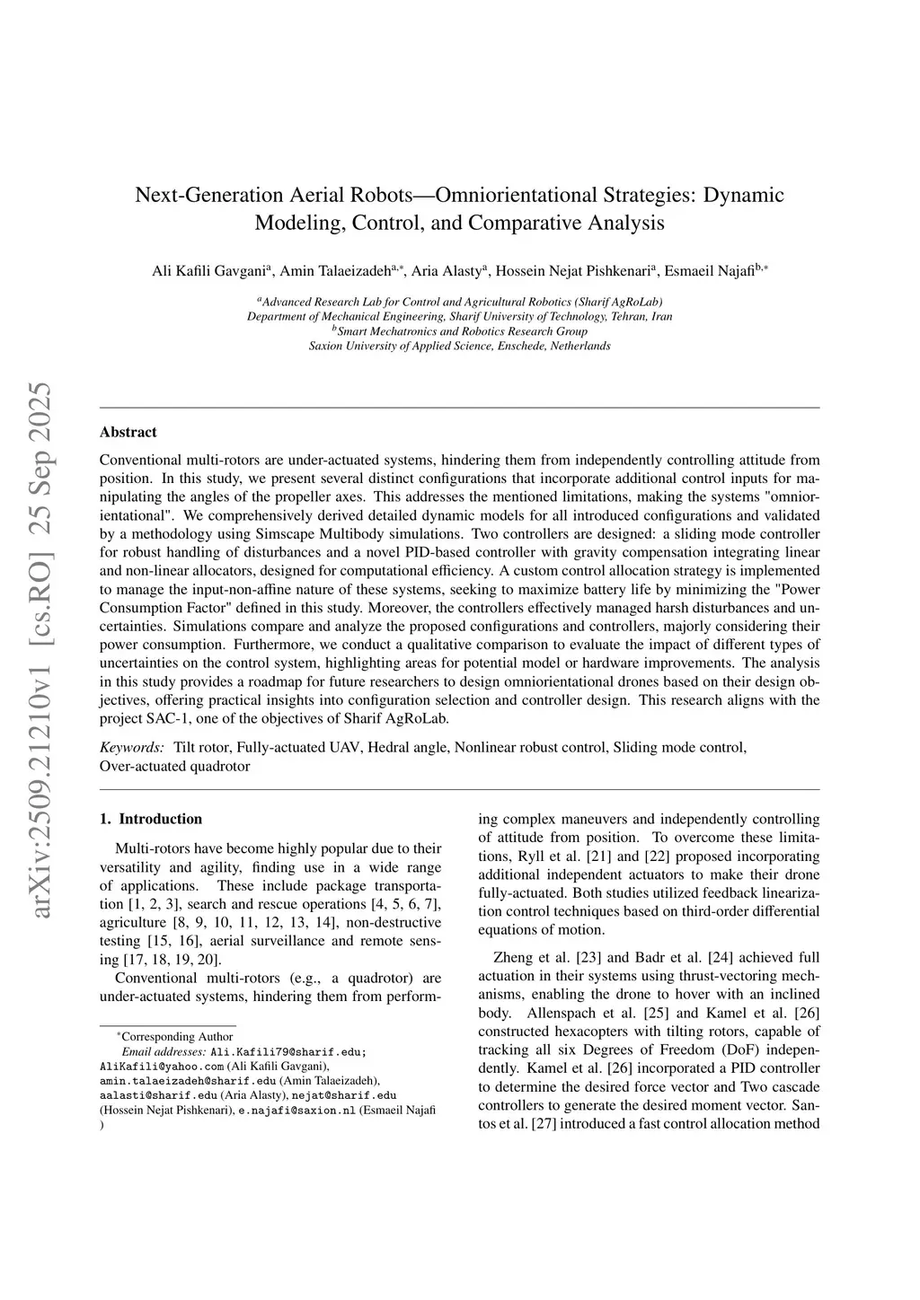 Conventional multi-rotors are under-actuated systems, hindering them from independently controlling attitude from position. In this study, we present several distinct configurations that incorporate additional control inputs for manipulating the angles of the propeller axes. This addresses the mentioned limitations, making the systems "omniorientational". We comprehensively derived detailed dynamic models for all introduced configurations and validated by a methodology using Simscape Multibody simulations. Two controllers are designed: a sliding mode controller for robust handling of disturbances and a novel PID-based controller with gravity compensation integrating linear and non-linear allocators, designed for computational efficiency. A custom control allocation strategy is implemented to manage the input-non-affine nature of these systems, seeking to maximize battery life by minimizing the "Power Consumption Factor" defined in this study. Moreover, the controllers effectively managed harsh disturbances and uncertainties. Simulations compare and analyze the proposed configurations and controllers, majorly considering their power consumption. Furthermore, we conduct a qualitative comparison to evaluate the impact of different types of uncertainties on the control system, highlighting areas for potential model or hardware improvements. The analysis in this study provides a roadmap for future researchers to design omniorientational drones based on their design objectives, offering practical insights into configuration selection and controller design. This research aligns with the project SAC-1, one of the objectives of Sharif AgRoLab.