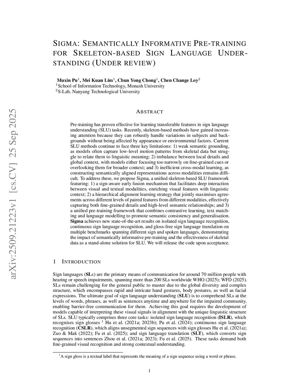 Pre-training has proven effective for learning transferable features in sign language understanding (SLU) tasks. Recently, skeleton-based methods have gained increasing attention because they can robustly handle variations in subjects and backgrounds without being affected by appearance or environmental factors. Current SLU methods continue to face three key limitations: 1) weak semantic grounding, as models often capture low-level motion patterns from skeletal data but struggle to relate them to linguistic meaning; 2) imbalance between local details and global context, with models either focusing too narrowly on fine-grained cues or overlooking them for broader context; and 3) inefficient cross-modal learning, as constructing semantically aligned representations across modalities remains difficult. To address these, we propose Sigma, a unified skeleton-based SLU framework featuring: 1) a sign-aware early fusion mechanism that facilitates deep interaction between visual and textual modalities, enriching visual features with linguistic context; 2) a hierarchical alignment learning strategy that jointly maximises agreements across different levels of paired features from different modalities, effectively capturing both fine-grained details and high-level semantic relationships; and 3) a unified pre-training framework that combines contrastive learning, text matching and language modelling to promote semantic consistency and generalisation. Sigma achieves new state-of-the-art results on isolated sign language recognition, continuous sign language recognition, and gloss-free sign language translation on multiple benchmarks spanning different sign and spoken languages, demonstrating the impact of semantically informative pre-training and the effectiveness of skeletal data as a stand-alone solution for SLU.