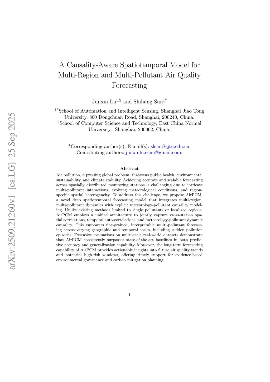 Air pollution, a pressing global problem, threatens public health, environmental sustainability, and climate stability. Achieving accurate and scalable forecasting across spatially distributed monitoring stations is challenging due to intricate multi-pollutant interactions, evolving meteorological conditions, and region specific spatial heterogeneity. To address this challenge, we propose AirPCM, a novel deep spatiotemporal forecasting model that integrates multi-region, multi-pollutant dynamics with explicit meteorology-pollutant causality modeling. Unlike existing methods limited to single pollutants or localized regions, AirPCM employs a unified architecture to jointly capture cross-station spatial correlations, temporal auto-correlations, and meteorology-pollutant dynamic causality. This empowers fine-grained, interpretable multi-pollutant forecasting across varying geographic and temporal scales, including sudden pollution episodes. Extensive evaluations on multi-scale real-world datasets demonstrate that AirPCM consistently surpasses state-of-the-art baselines in both predictive accuracy and generalization capability. Moreover, the long-term forecasting capability of AirPCM provides actionable insights into future air quality trends and potential high-risk windows, offering timely support for evidence-based environmental governance and carbon mitigation planning.