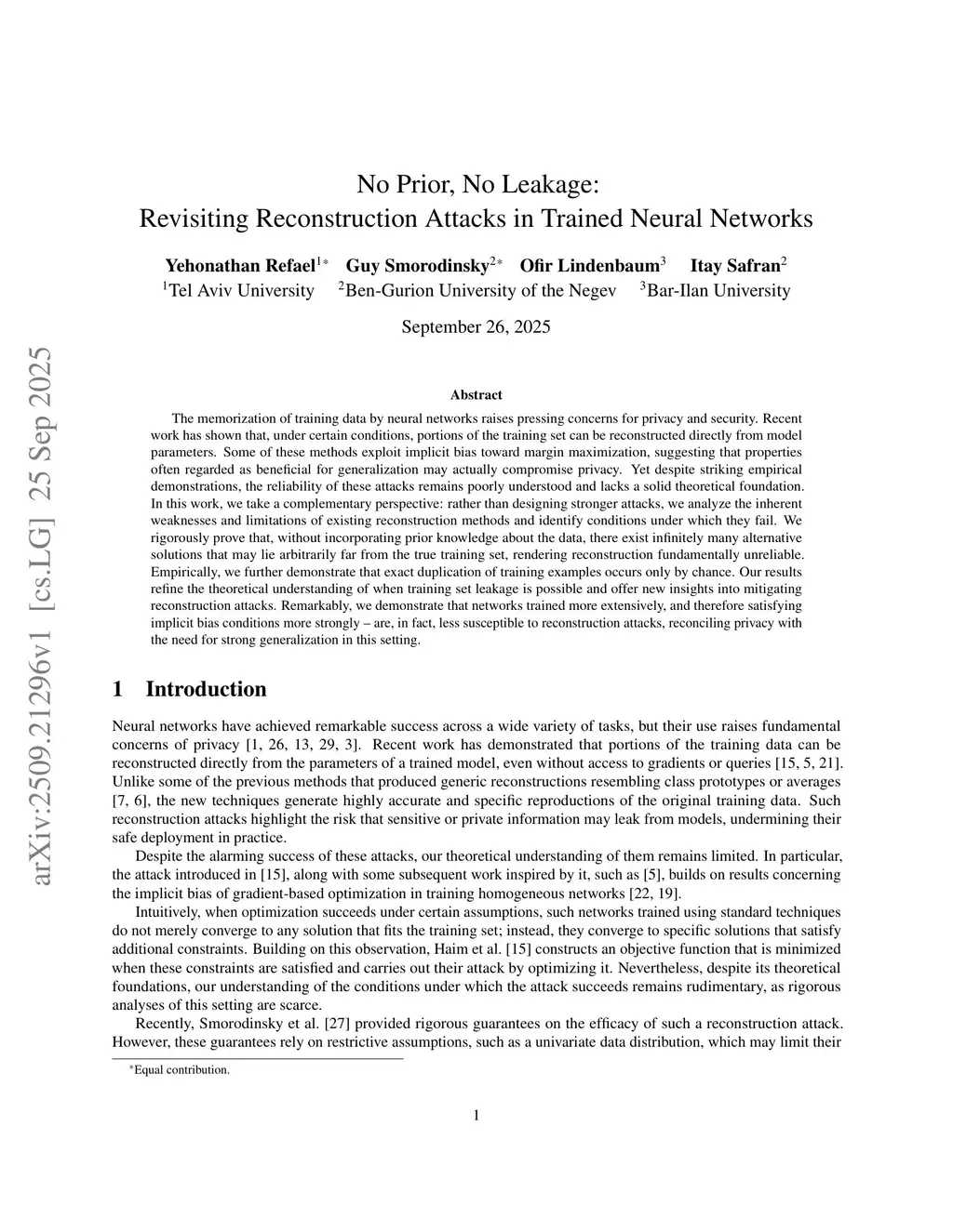 The memorization of training data by neural networks raises pressing concerns for privacy and security. Recent work has shown that, under certain conditions, portions of the training set can be reconstructed directly from model parameters. Some of these methods exploit implicit bias toward margin maximization, suggesting that properties often regarded as beneficial for generalization may actually compromise privacy. Yet despite striking empirical demonstrations, the reliability of these attacks remains poorly understood and lacks a solid theoretical foundation. In this work, we take a complementary perspective: rather than designing stronger attacks, we analyze the inherent weaknesses and limitations of existing reconstruction methods and identify conditions under which they fail. We rigorously prove that, without incorporating prior knowledge about the data, there exist infinitely many alternative solutions that may lie arbitrarily far from the true training set, rendering reconstruction fundamentally unreliable. Empirically, we further demonstrate that exact duplication of training examples occurs only by chance. Our results refine the theoretical understanding of when training set leakage is possible and offer new insights into mitigating reconstruction attacks. Remarkably, we demonstrate that networks trained more extensively, and therefore satisfying implicit bias conditions more strongly -- are, in fact, less susceptible to reconstruction attacks, reconciling privacy with the need for strong generalization in this setting.