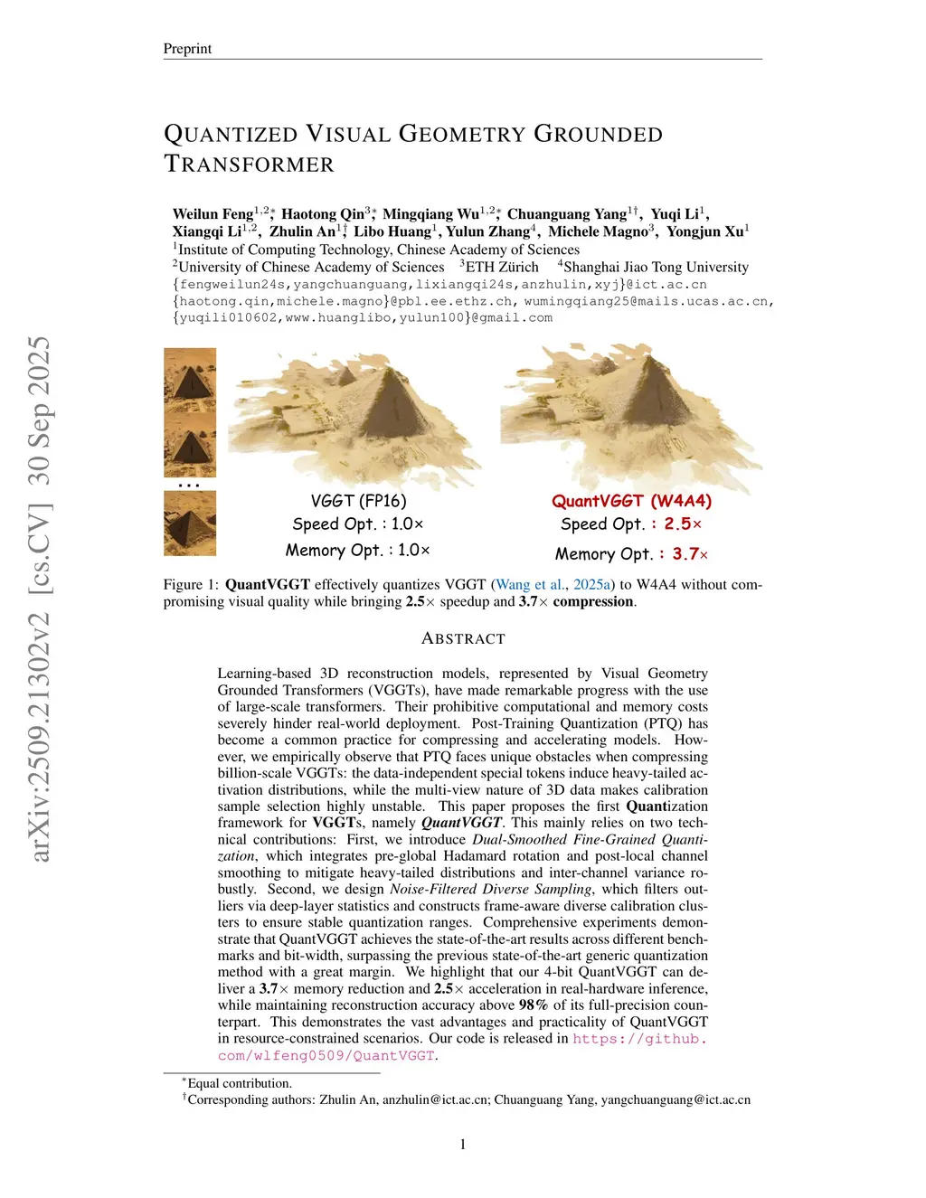 Learning-based 3D reconstruction models, represented by Visual Geometry Grounded Transformers (VGGTs), have made remarkable progress with the use of large-scale transformers. Their prohibitive computational and memory costs severely hinder real-world deployment. Post-Training Quantization (PTQ) has become a common practice for compressing and accelerating models. However, we empirically observe that PTQ faces unique obstacles when compressing billion-scale VGGTs: the data-independent special tokens induce heavy-tailed activation distributions, while the multi-view nature of 3D data makes calibration sample selection highly unstable. This paper proposes the first Quantization framework for VGGTs, namely QuantVGGT. This mainly relies on two technical contributions: First, we introduce Dual-Smoothed Fine-Grained Quantization, which integrates pre-global Hadamard rotation and post-local channel smoothing to mitigate heavy-tailed distributions and inter-channel variance robustly. Second, we design Noise-Filtered Diverse Sampling, which filters outliers via deep-layer statistics and constructs frame-aware diverse calibration clusters to ensure stable quantization ranges. Comprehensive experiments demonstrate that QuantVGGT achieves the state-of-the-art results across different benchmarks and bit-width, surpassing the previous state-of-the-art generic quantization method with a great margin. We highlight that our 4-bit QuantVGGT can deliver a 3.7 memory reduction and 2.5 acceleration in real-hardware inference, while maintaining reconstruction accuracy above 98\% of its full-precision counterpart. This demonstrates the vast advantages and practicality of QuantVGGT in resource-constrained scenarios. Our code is released inthis https URL.