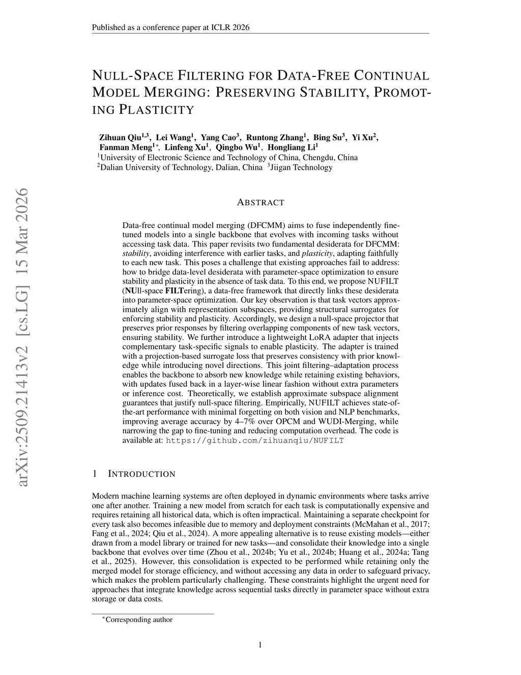 Data-free continual model merging (DFCMM) aims to fuse independently fine-tuned models into a single backbone that evolves with incoming tasks without accessing task data. This paper revisits two fundamental desiderata for DFCMM: stability, avoiding interference with earlier tasks, and plasticity, adapting faithfully to each new task. This poses a challenge that existing approaches fail to address: how to bridge data-level desiderata with parameter-space optimization to ensure stability and plasticity in the absence of task data. To this end, we propose NUFILT (NUll-space FILTering), a data-free framework that directly links these desiderata into parameter-space optimization. Our key observation is that task vectors approximately align with representation subspaces, providing structural surrogates for enforcing stability and plasticity. Accordingly, we design a null-space projector that preserves prior responses by filtering overlapping components of new task vectors, ensuring stability. We further introduce a lightweight LoRA adapter that injects complementary task-specific signals to enable plasticity. The adapter is trained with a projection-based surrogate loss that preserves consistency with prior knowledge while introducing novel directions. This joint filtering-adaptation process enables the backbone to absorb new knowledge while retaining existing behaviors, with updates fused back in a layer-wise linear fashion without extra parameters or inference cost. Theoretically, we establish approximate subspace alignment guarantees that justify null-space filtering. Empirically, NUFILT achieves state-of-the-art performance with minimal forgetting on both vision and NLP benchmarks, improving average accuracy by 4-7% over OPCM and WUDI-Merging, while narrowing the gap to fine-tuning and reducing computation overhead. The code is available at:this https URL