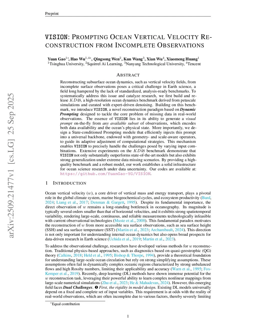 Reconstructing subsurface ocean dynamics, such as vertical velocity fields, from incomplete surface observations poses a critical challenge in Earth science, a field long hampered by the lack of standardized, analysis-ready benchmarks. To systematically address this issue and catalyze research, we first build and release KD48, a high-resolution ocean dynamics benchmark derived from petascale simulations and curated with expert-driven denoising. Building on this benchmark, we introduce VISION, a novel reconstruction paradigm based on Dynamic Prompting designed to tackle the core problem of missing data in real-world observations. The essence of VISION lies in its ability to generate a visual prompt on-the-fly from any available subset of observations, which encodes both data availability and the ocean's physical state. More importantly, we design a State-conditioned Prompting module that efficiently injects this prompt into a universal backbone, endowed with geometry- and scale-aware operators, to guide its adaptive adjustment of computational strategies. This mechanism enables VISION to precisely handle the challenges posed by varying input combinations. Extensive experiments on the KD48 benchmark demonstrate that VISION not only substantially outperforms state-of-the-art models but also exhibits strong generalization under extreme data missing scenarios. By providing a high-quality benchmark and a robust model, our work establishes a solid infrastructure for ocean science research under data uncertainty. Our codes are available at:this https URL.