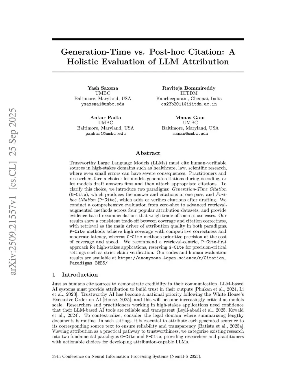 Trustworthy Large Language Models (LLMs) must cite human-verifiable sources in high-stakes domains such as healthcare, law, academia, and finance, where even small errors can have severe consequences. Practitioners and researchers face a choice: let models generate citations during decoding, or let models draft answers first and then attach appropriate citations. To clarify this choice, we introduce two paradigms: Generation-Time Citation (G-Cite), which produces the answer and citations in one pass, and Post-hoc Citation (P-Cite), which adds or verifies citations after drafting. We conduct a comprehensive evaluation from zero-shot to advanced retrieval-augmented methods across four popular attribution datasets and provide evidence-based recommendations that weigh trade-offs across use cases. Our results show a consistent trade-off between coverage and citation correctness, with retrieval as the main driver of attribution quality in both paradigms. P-Cite methods achieve high coverage with competitive correctness and moderate latency, whereas G-Cite methods prioritize precision at the cost of coverage and speed. We recommend a retrieval-centric, P-Cite-first approach for high-stakes applications, reserving G-Cite for precision-critical settings such as strict claim verification. Our codes and human evaluation results are available atthis https URL