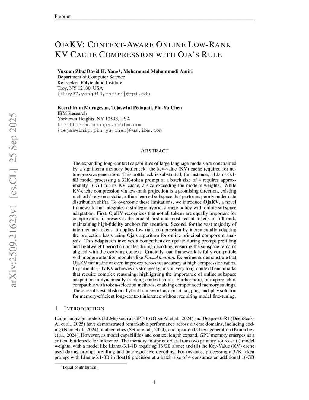 OjaKV: Context-Aware Online Low-Rank KV Cache Compression with Oja's Rule