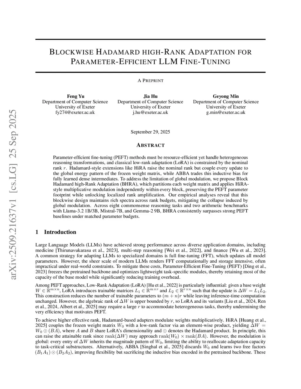 Blockwise Hadamard high-Rank Adaptation for Parameter-Efficient LLM Fine-Tuning