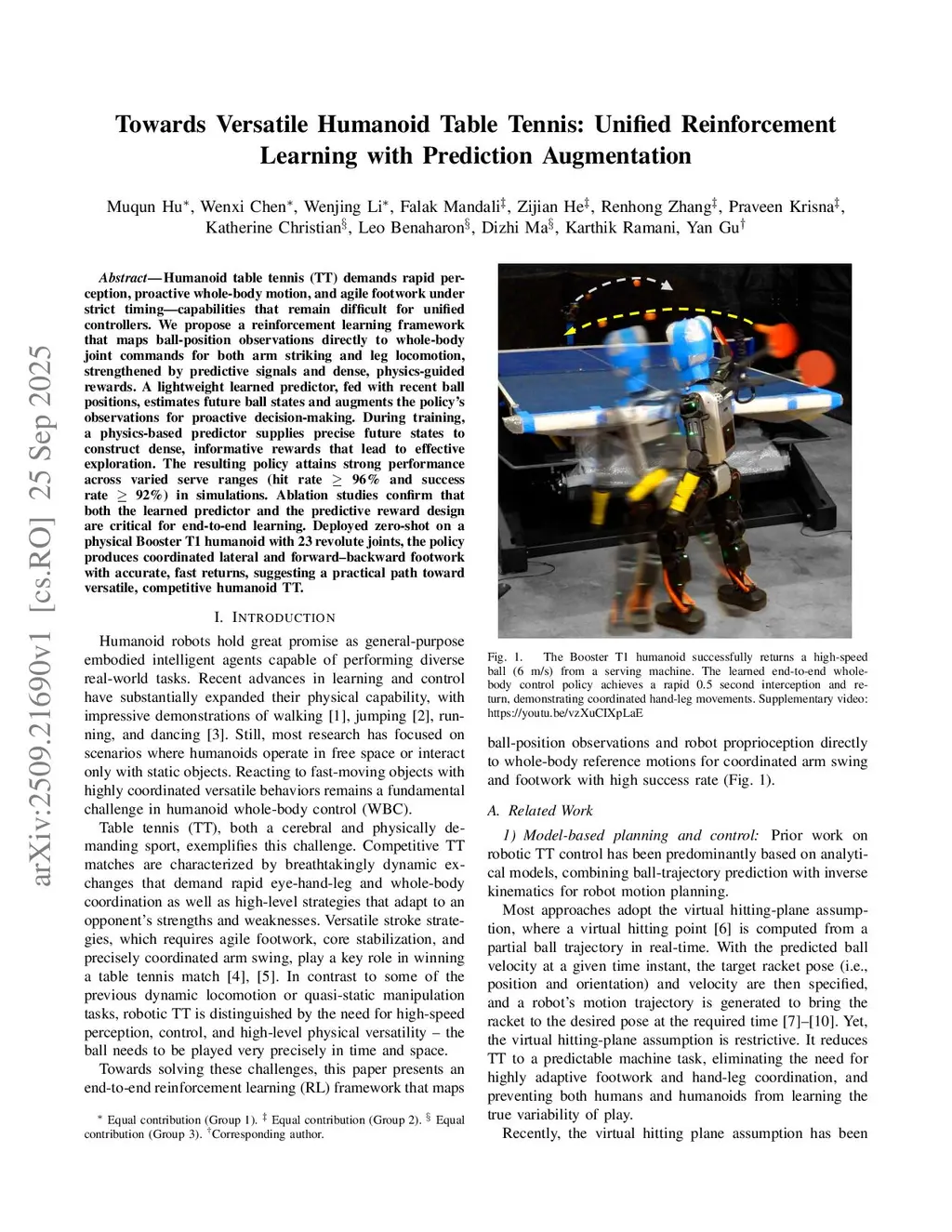 Humanoid table tennis (TT) demands rapid perception, proactive whole-body motion, and agile footwork under strict timing -- capabilities that remain difficult for unified controllers. We propose a reinforcement learning framework that maps ball-position observations directly to whole-body joint commands for both arm striking and leg locomotion, strengthened by predictive signals and dense, physics-guided rewards. A lightweight learned predictor, fed with recent ball positions, estimates future ball states and augments the policy's observations for proactive decision-making. During training, a physics-based predictor supplies precise future states to construct dense, informative rewards that lead to effective exploration. The resulting policy attains strong performance across varied serve ranges (hit rate 96% and success rate 92%) in simulations. Ablation studies confirm that both the learned predictor and the predictive reward design are critical for end-to-end learning. Deployed zero-shot on a physical Booster T1 humanoid with 23 revolute joints, the policy produces coordinated lateral and forward-backward footwork with accurate, fast returns, suggesting a practical path toward versatile, competitive humanoid TT.