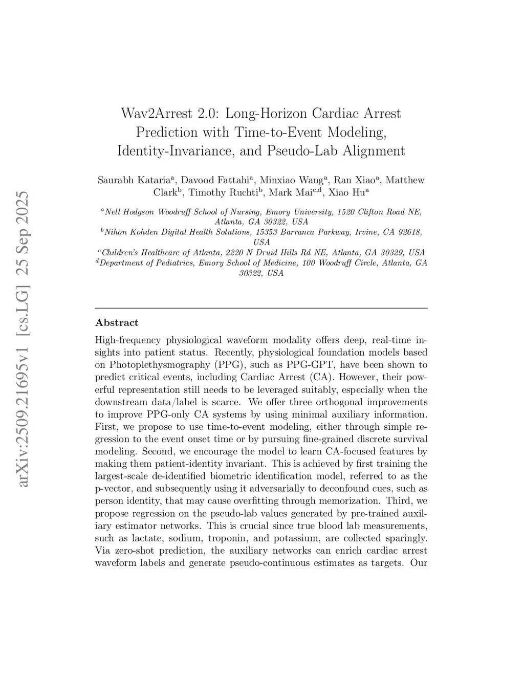 Wav2Arrest 2.0: Long-Horizon Cardiac Arrest Prediction with Time-to-Event Modeling, Identity-Invariance, and Pseudo-Lab Alignment