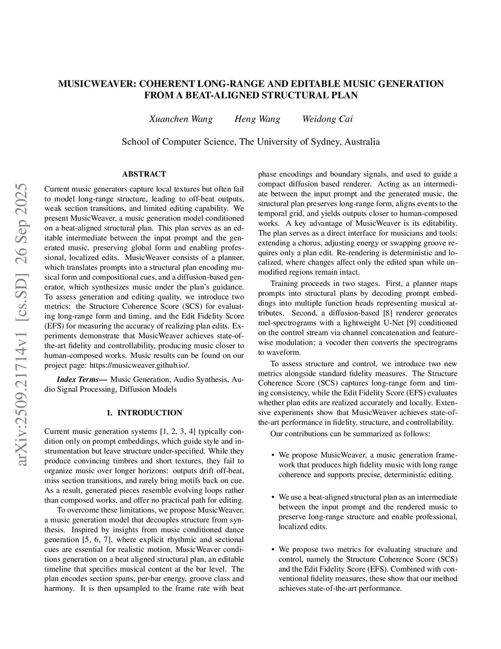 Recent advances in music generation produce impressive samples, however, practical creation still lacks two key capabilities: composer-style structural editing and minute-scale coherence. We present MusicWeaver, a framework for generating and editing long-range music using a human-interpretable intermediate representation with guaranteed edit locality. MusicWeaver decomposes generation into two stages: it first predicts a structured plan, a multi-level song program encoding musical attributes that composers can directly edit, and then renders audio conditioned on this plan. To ensure minute-scale coherence, we introduce a Global-Local Diffusion Transformer, where a global path captures long-range musical progression via compressed representations and memory, while a local path synthesizes fine-grained acoustic detail. We further propose a Motif Memory Retrieval module that enables consistent motif recurrence with controllable variation. For editing, we propose Projected Diffusion Inpainting, an inpainting method that denoises only user-specified regions and preserves unchanged content, allowing repeated edits without drift. Finally, we introduce Structure Coherence Score and Edit Fidelity Score to evaluate long-range form and edit realization. Experiments demonstrate that MusicWeaver achieves state-of-the-art fidelity, controllability, and long-range coherence.