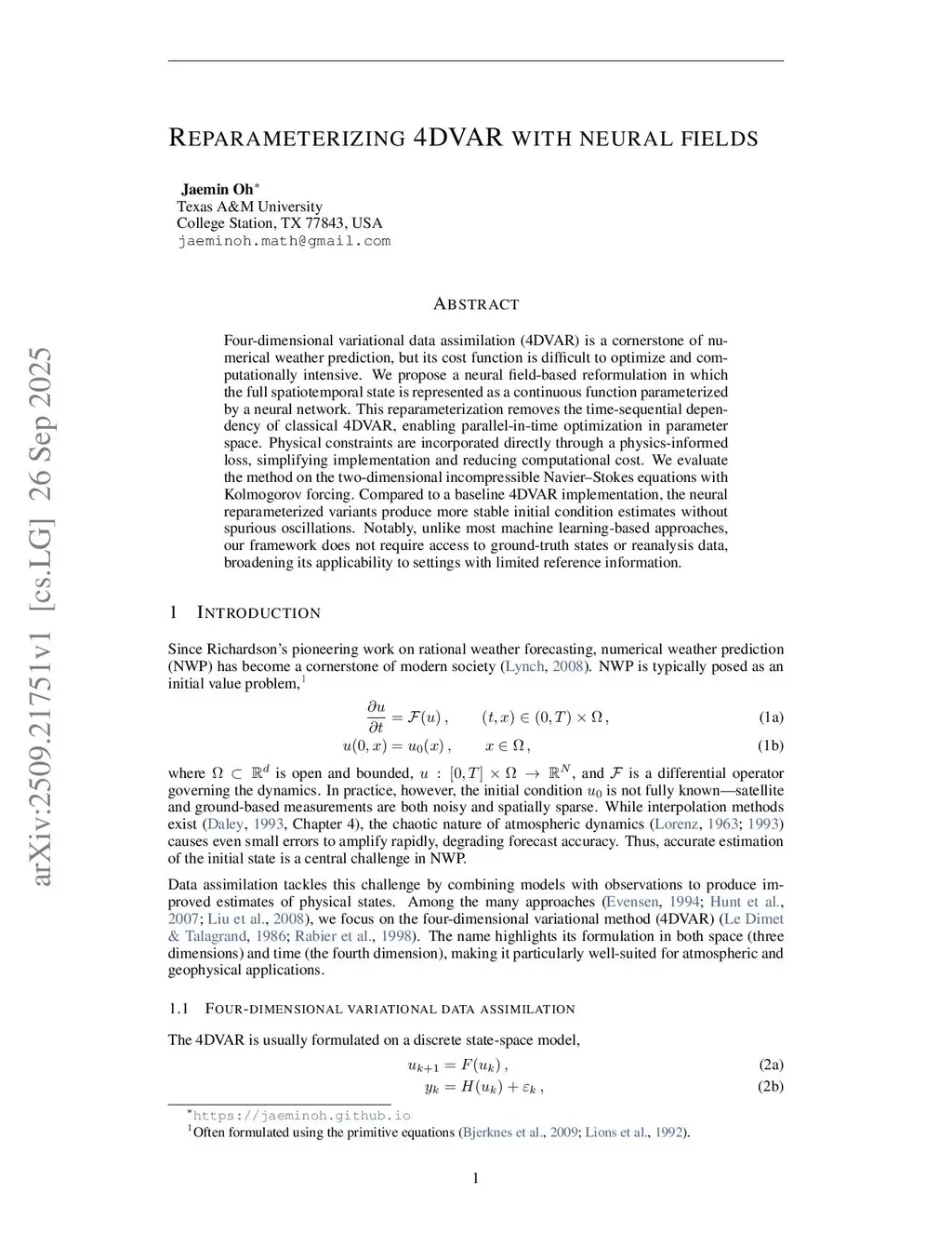 Four-dimensional variational data assimilation (4DVAR) is a cornerstone of numerical weather prediction, but its cost function is difficult to optimize and computationally intensive. We propose a neural field-based reformulation in which the full spatiotemporal state is represented as a continuous function parameterized by a neural network. This reparameterization removes the time-sequential dependency of classical 4DVAR, enabling parallel-in-time optimization in parameter space. Physical constraints are incorporated directly through a physics-informed loss, simplifying implementation and reducing computational cost. We evaluate the method on the two-dimensional incompressible Navier--Stokes equations with Kolmogorov forcing. Compared to a baseline 4DVAR implementation, the neural reparameterized variants produce more stable initial condition estimates without spurious oscillations. Notably, unlike most machine learning-based approaches, our framework does not require access to ground-truth states or reanalysis data, broadening its applicability to settings with limited reference information.