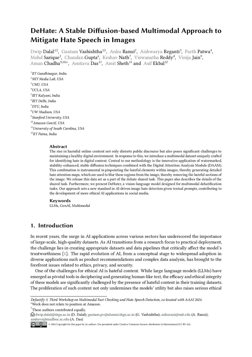 The rise in harmful online content not only distorts public discourse but also poses significant challenges to maintaining a healthy digital environment. In response to this, we introduce a multimodal dataset uniquely crafted for identifying hate in digital content. Central to our methodology is the innovative application of watermarked, stability-enhanced, stable diffusion techniques combined with the Digital Attention Analysis Module (DAAM). This combination is instrumental in pinpointing the hateful elements within images, thereby generating detailed hate attention maps, which are used to blur these regions from the image, thereby removing the hateful sections of the image. We release this data set as a part of the dehate shared task. This paper also describes the details of the shared task. Furthermore, we present DeHater, a vision-language model designed for multimodal dehatification tasks. Our approach sets a new standard in AI-driven image hate detection given textual prompts, contributing to the development of more ethical AI applications in social media.