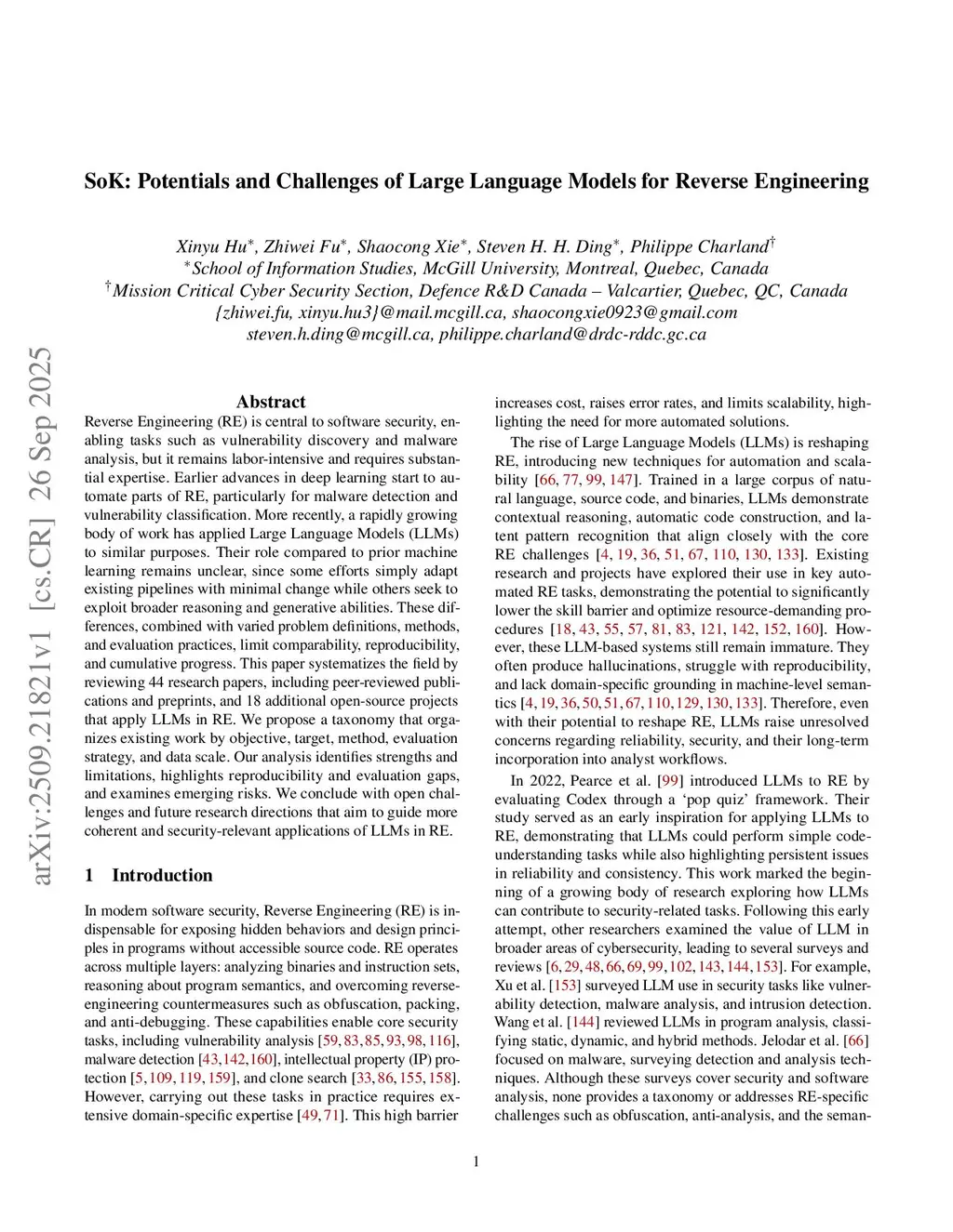 Reverse Engineering (RE) is central to software security, enabling tasks such as vulnerability discovery and malware analysis, but it remains labor-intensive and requires substantial expertise. Earlier advances in deep learning start to automate parts of RE, particularly for malware detection and vulnerability classification. More recently, a rapidly growing body of work has applied Large Language Models (LLMs) to similar purposes. Their role compared to prior machine learning remains unclear, since some efforts simply adapt existing pipelines with minimal change while others seek to exploit broader reasoning and generative abilities. These differences, combined with varied problem definitions, methods, and evaluation practices, limit comparability, reproducibility, and cumulative progress. This paper systematizes the field by reviewing 44 research papers, including peer-reviewed publications and preprints, and 18 additional open-source projects that apply LLMs in RE. We propose a taxonomy that organizes existing work by objective, target, method, evaluation strategy, and data scale. Our analysis identifies strengths and limitations, highlights reproducibility and evaluation gaps, and examines emerging risks. We conclude with open challenges and future research directions that aim to guide more coherent and security-relevant applications of LLMs in RE.