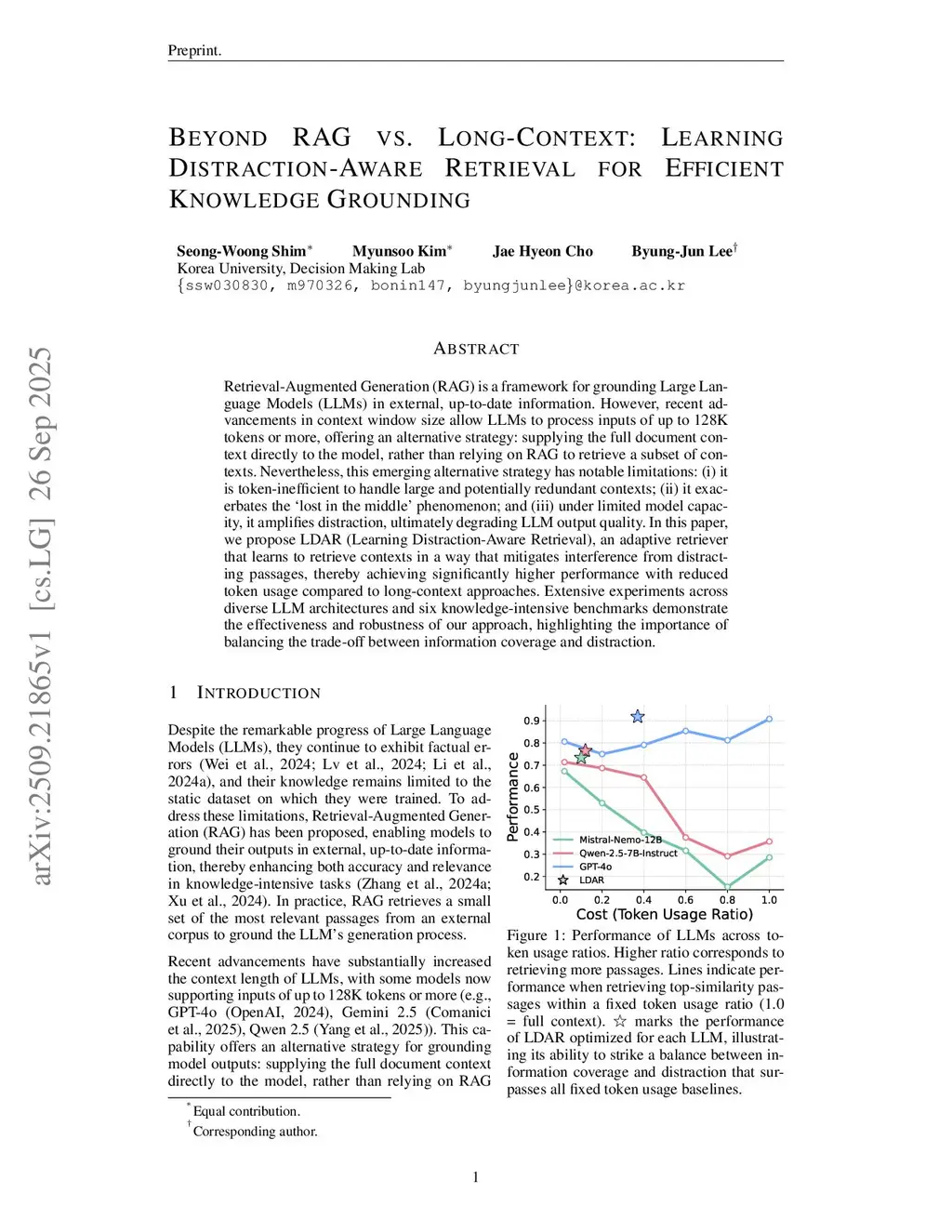 Retrieval-Augmented Generation (RAG) is a framework for grounding Large Language Models (LLMs) in external, up-to-date information. However, recent advancements in context window size allow LLMs to process inputs of up to 128K tokens or more, offering an alternative strategy: supplying the full document context directly to the model, rather than relying on RAG to retrieve a subset of contexts. Nevertheless, this emerging alternative strategy has notable limitations: (i) it is token-inefficient to handle large and potentially redundant contexts; (ii) it exacerbates the `lost in the middle' phenomenon; and (iii) under limited model capacity, it amplifies distraction, ultimately degrading LLM output quality. In this paper, we propose LDAR (Learning Distraction-Aware Retrieval), an adaptive retriever that learns to retrieve contexts in a way that mitigates interference from distracting passages, thereby achieving significantly higher performance with reduced token usage compared to long-context approaches. Extensive experiments across diverse LLM architectures and six knowledge-intensive benchmarks demonstrate the effectiveness and robustness of our approach, highlighting the importance of balancing the trade-off between information coverage and distraction.
