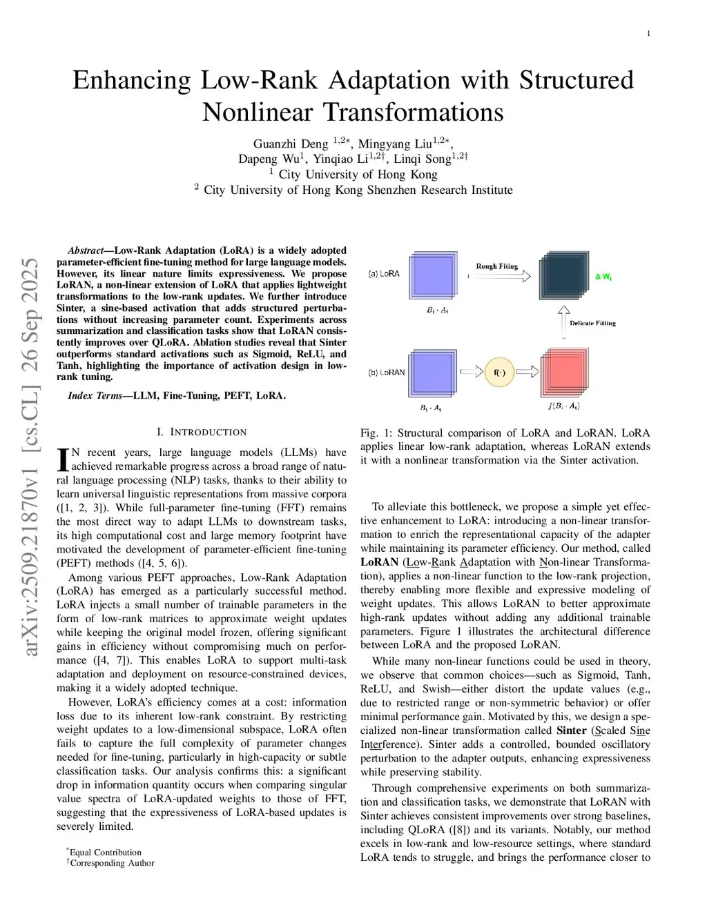 Low-Rank Adaptation (LoRA) is a widely adopted parameter-efficient fine-tuning method for large language models. However, its linear nature limits expressiveness. We propose LoRAN, a non-linear extension of LoRA that applies lightweight transformations to the low-rank updates. We further introduce Sinter, a sine-based activation that adds structured perturbations without increasing parameter count. Experiments across summarization and classification tasks show that LoRAN consistently improves over QLoRA. Ablation studies reveal that Sinter outperforms standard activations such as Sigmoid, ReLU, and Tanh, highlighting the importance of activation design in lowrank tuning.