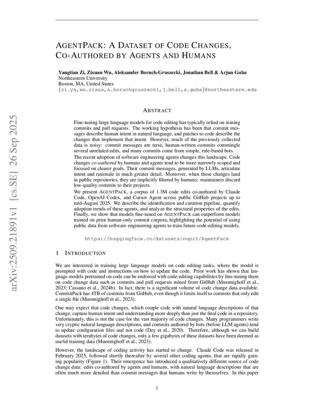 Fine-tuning large language models for code editing has typically relied on mining commits and pull requests. The working hypothesis has been that commit messages describe human intent in natural language, and patches to code describe the changes that implement that intent. However, much of the previously collected data is noisy: commit messages are terse, human-written commits commingle several unrelated edits, and many commits come from simple, rule-based bots.The recent adoption of software engineering agents changes this landscape. Code changes co-authored by humans and agents tend to be more narrowly scoped and focused on clearer goals. Their commit messages, generated by LLMs, articulate intent and rationale in much greater detail. Moreover, when these changes land in public repositories, they are implicitly filtered by humans: maintainers discard low-quality commits to their projects.We present AgentPack, a corpus of 1.3M code edits co-authored by Claude Code, OpenAI Codex, and Cursor Agent across public GitHub projects up to mid-August 2025. We describe the identification and curation pipeline, quantify adoption trends of these agents, and analyze the structural properties of the edits. Finally, we show that models fine-tuned on AgentPack can outperform models trained on prior human-only commit corpora, highlighting the potential of using public data from software engineering agents to train future code-editing models.